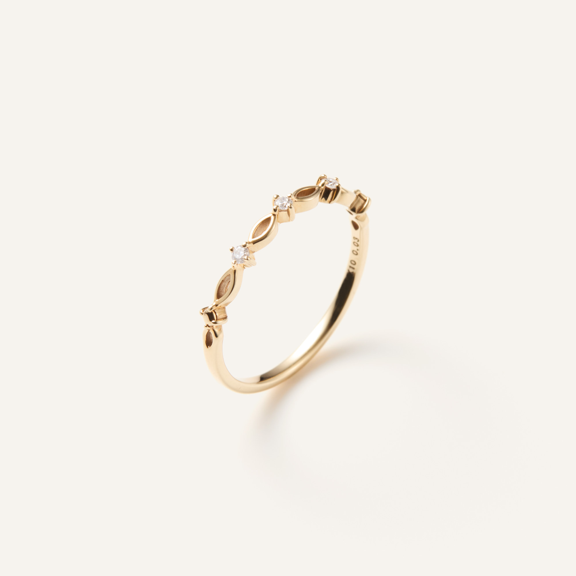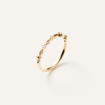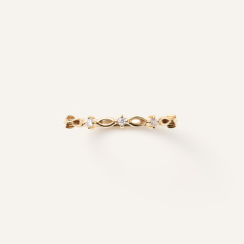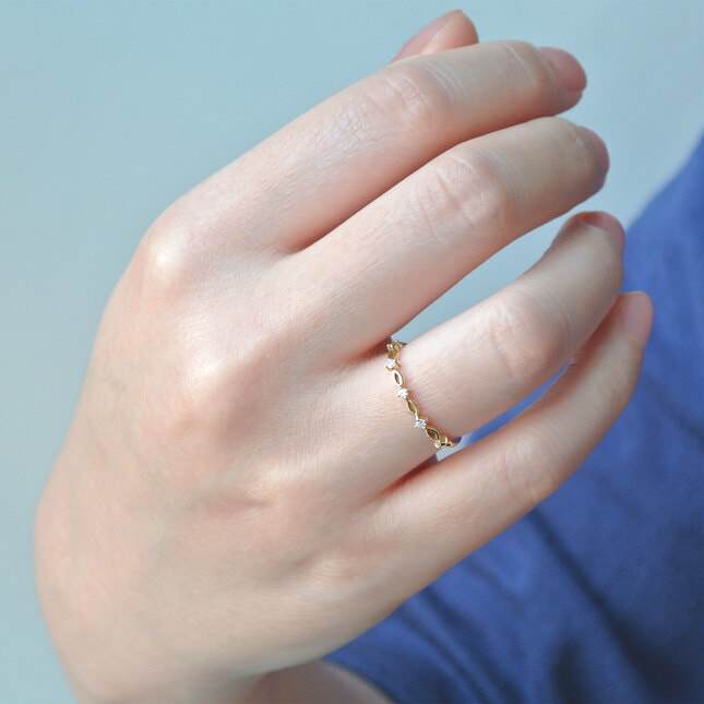 艶やかなイエローゴールドの華やかな輝きと、透け感のある美しいラインが指先をほっそりと美しく見せながら、手元を大人っぽく飾ります。