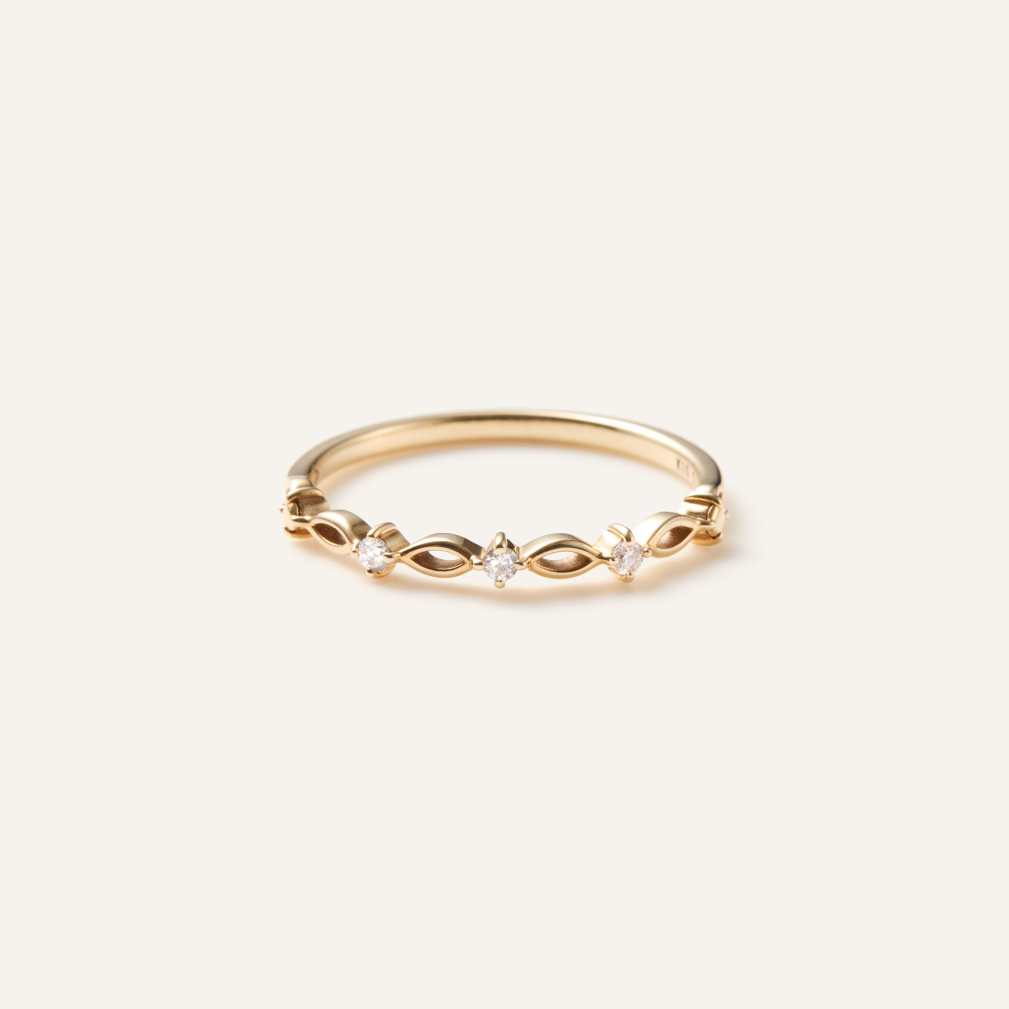 レースのように繊細で軽やかなデザインのアームに、3石のダイヤモンドの煌めきをプラスしたリング。