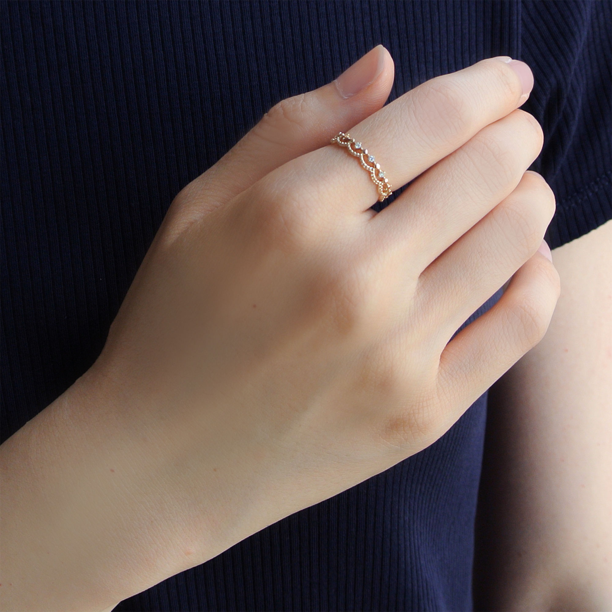 華奢なダイヤモンドのリングに、レースを思わせるような繊細なリングを重ね着けしているようなデザイン。