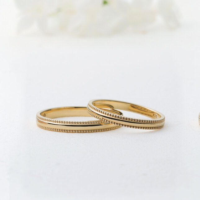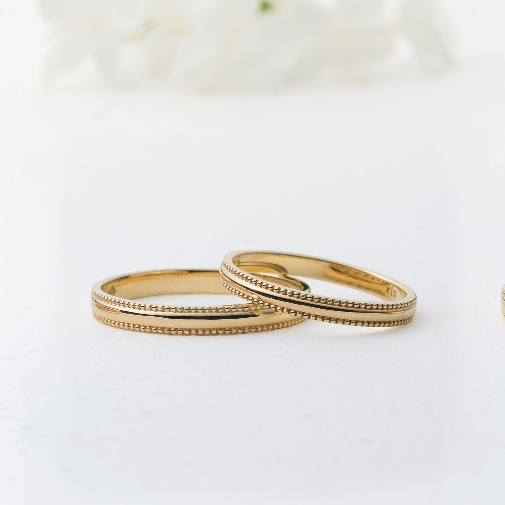 艶やかなイエローゴールドの光沢感と、ミルグレインの繊細でキラキラした輝きのコントラストが印象的です。