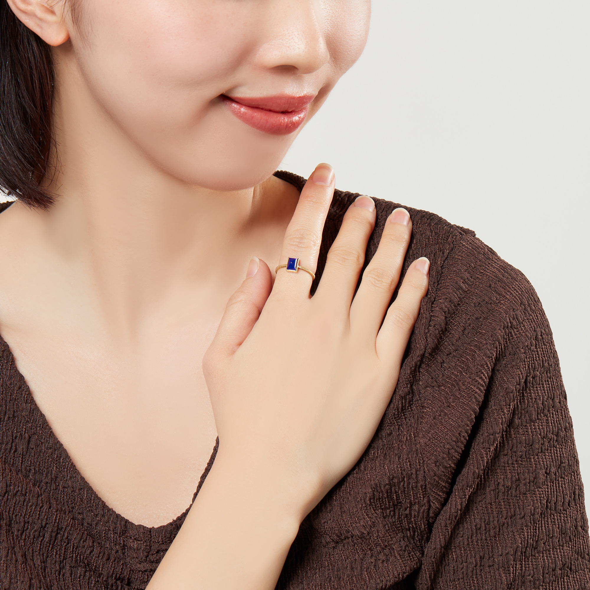 ラピスラズリはピラミッドカットで程よい立体感を演出。華やかなイエローゴールドの輝きとマッチして、表情のある手元に見せます。
