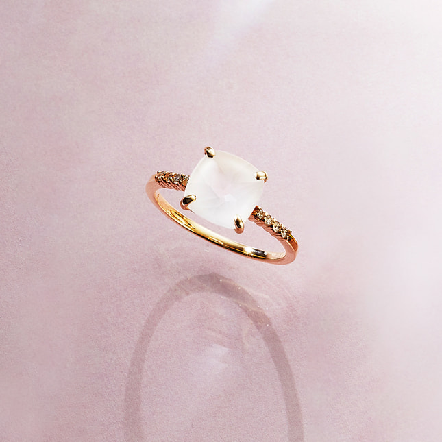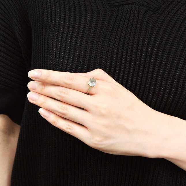 石の裏に施されたカットが見る角度によって表情を変える神秘的なクォーツのリング。