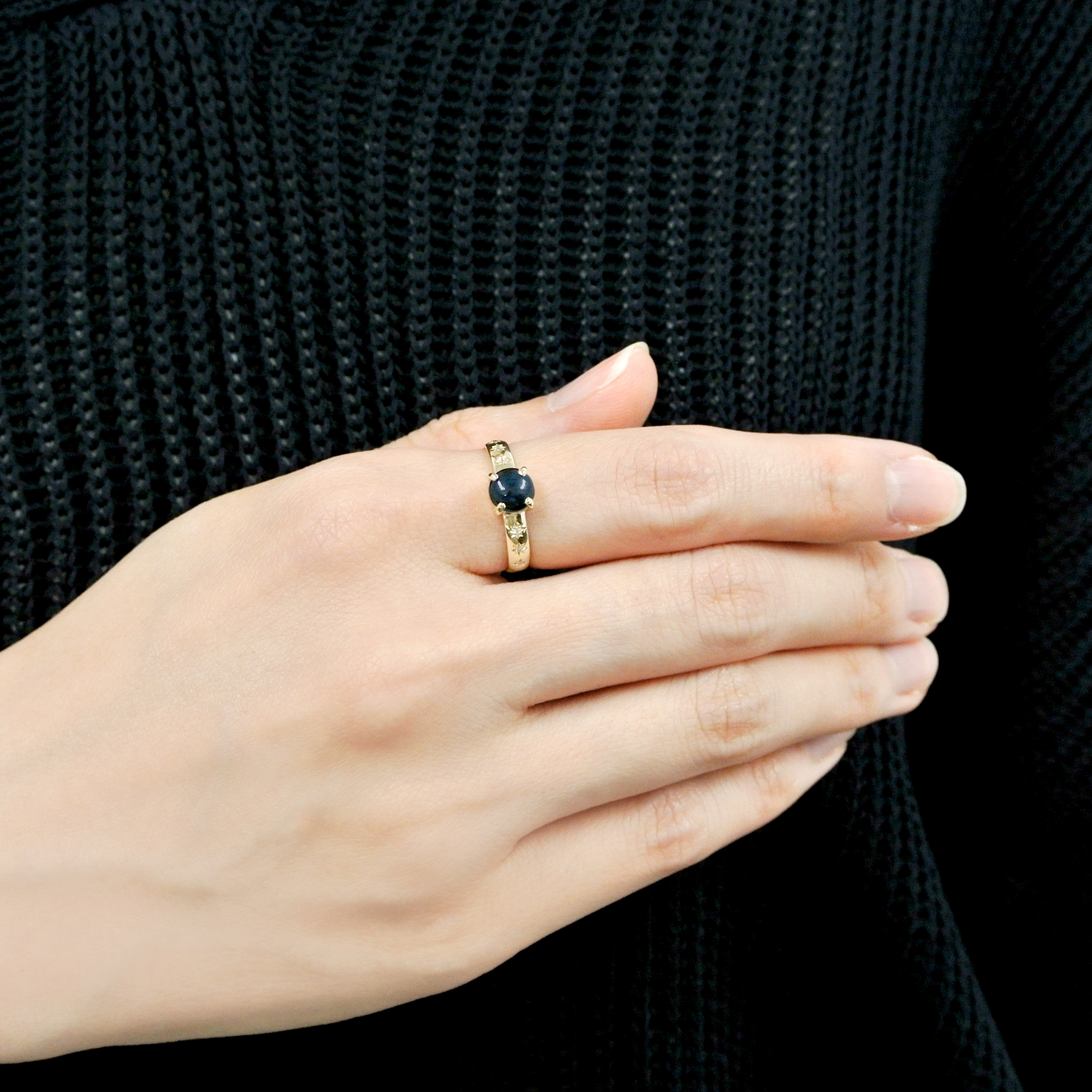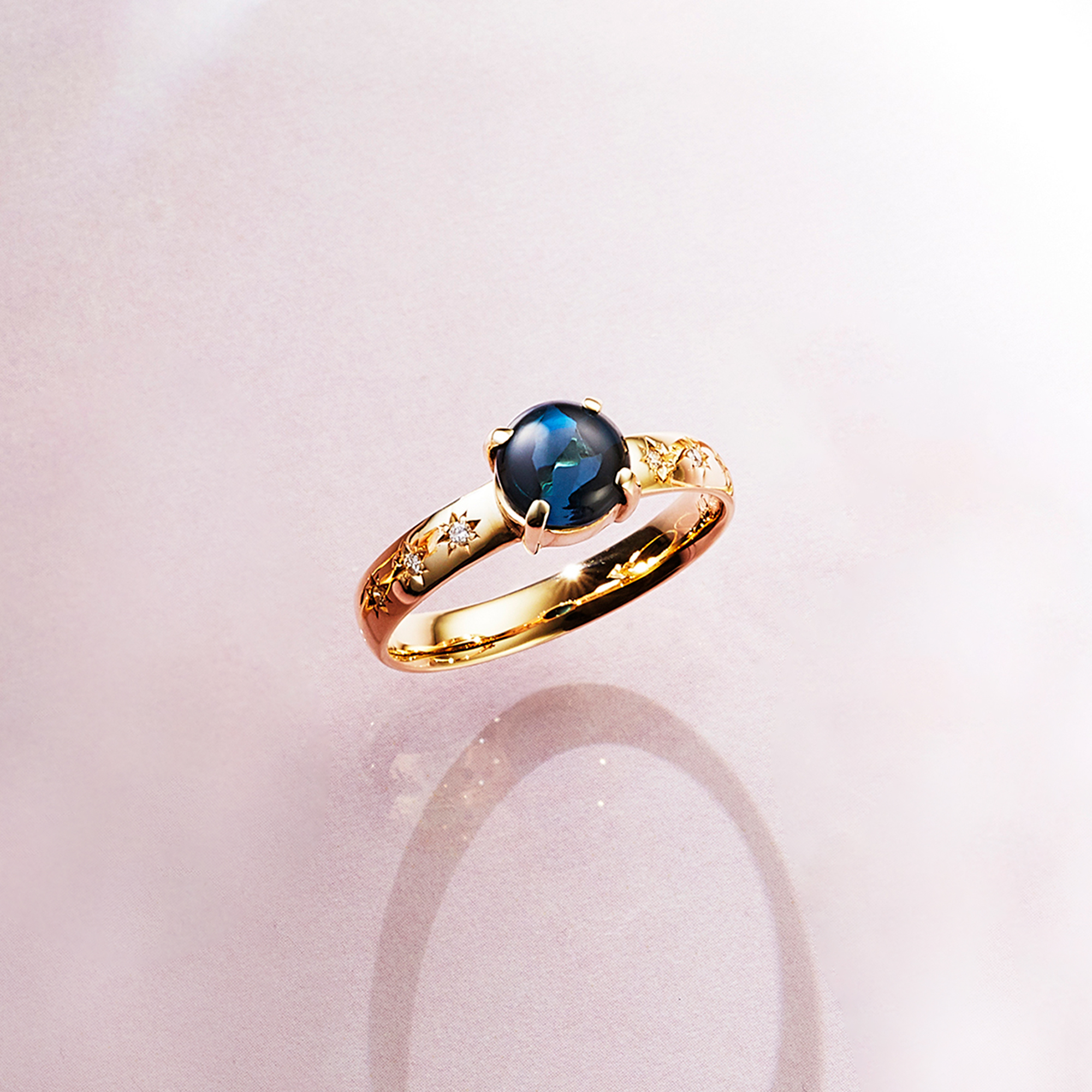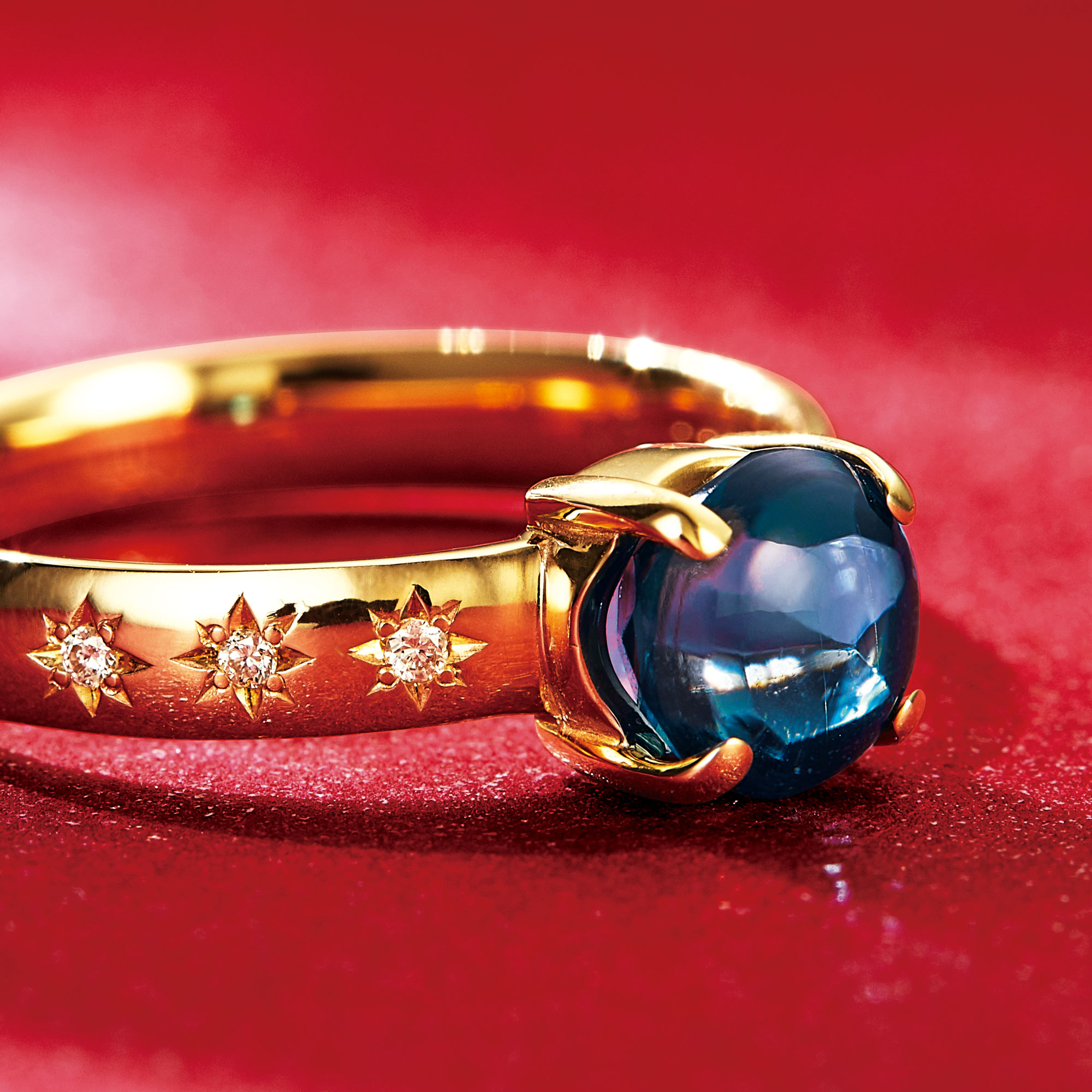 コロンとしたバフトップが大人っぽいブルートパーズのリングは、手元を見るたびに幸せな気分になれそう。
