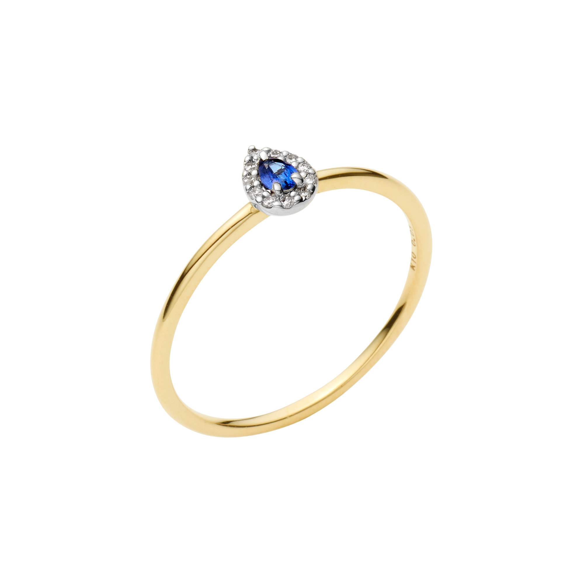 ペアシェイプカットを施したサファイアをダイヤモンドで取り巻いたリング。