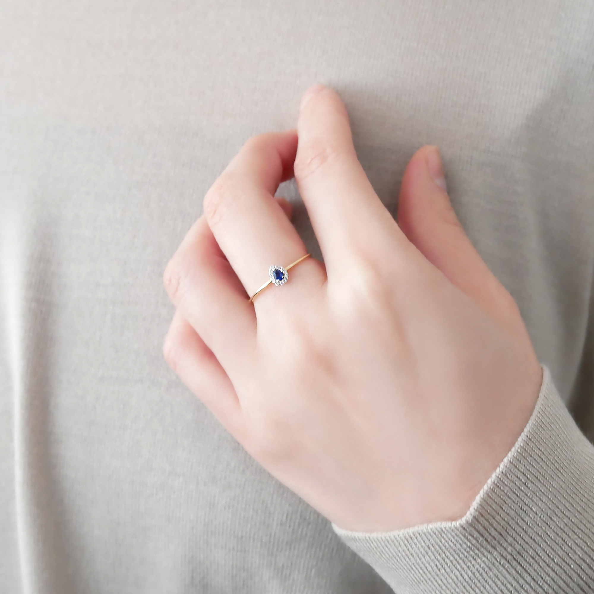 中央にセッティングされたサファイアには高さをもたせ、ふんわりと立体感のある仕上がり。