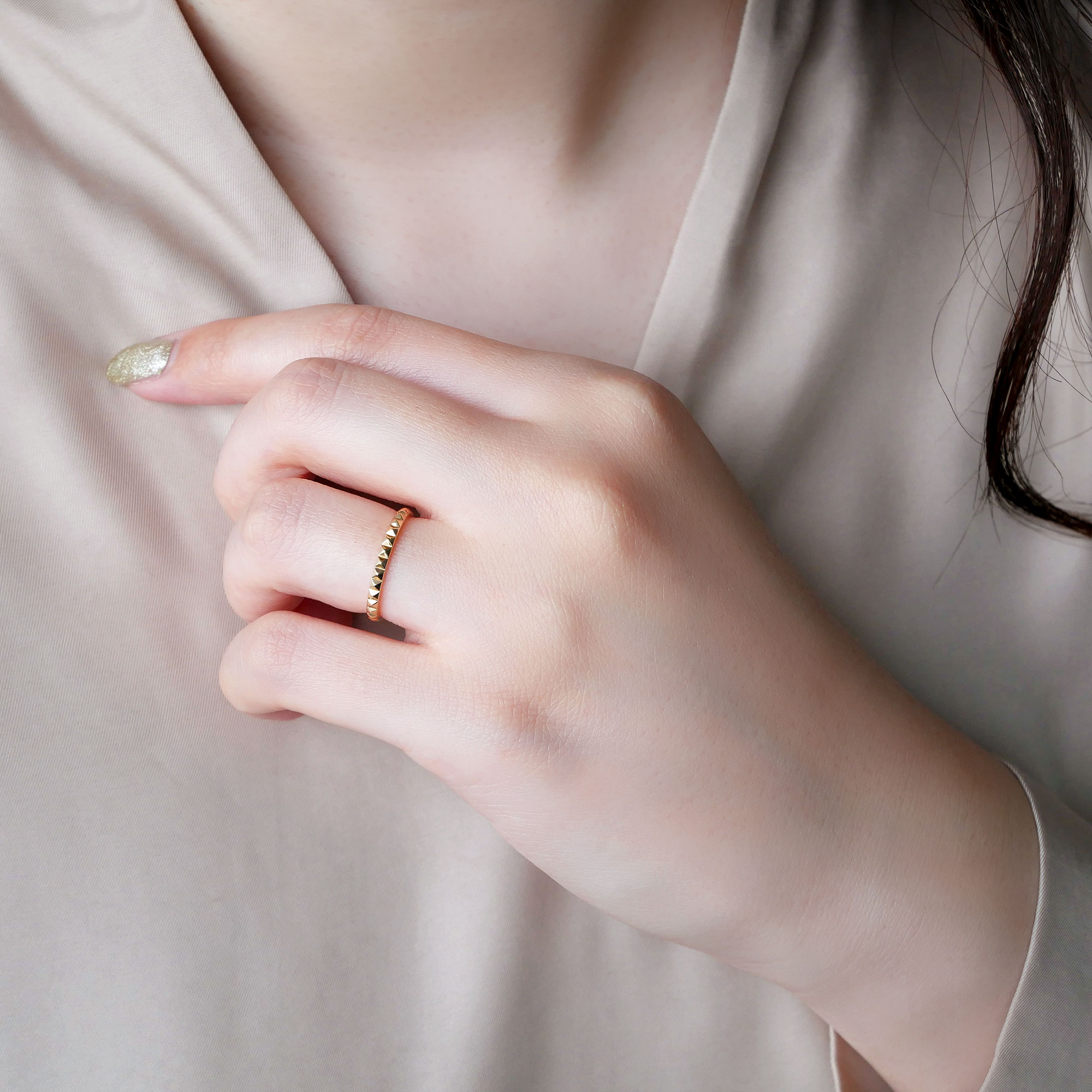 また、腕下に向かうにつれ徐々にピラミッドの高さを低くするようにデザインにしていますので、他の指に干渉することなく、指馴染みの良い仕上がりです。