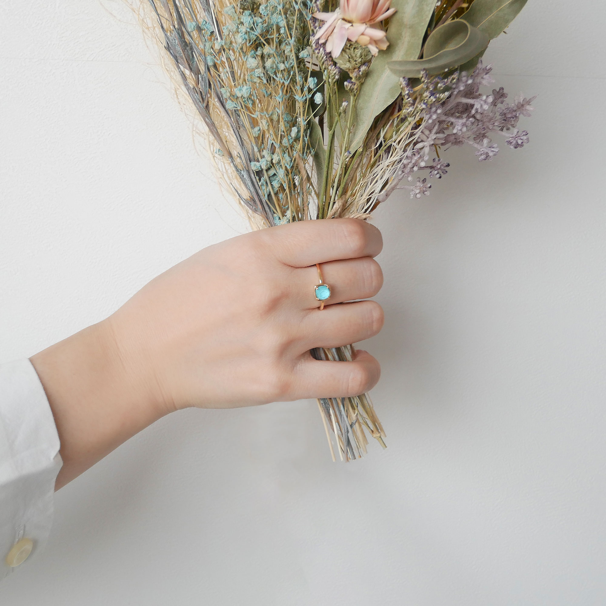 ターコイズに透明感のあるクォーツを重ねることで、夏らしく爽やかな色合いとみずみずしさを演出。