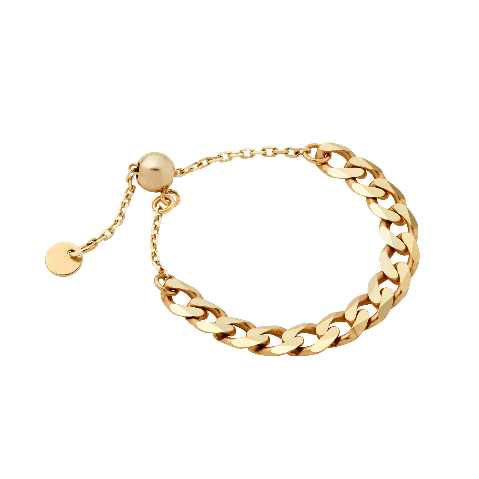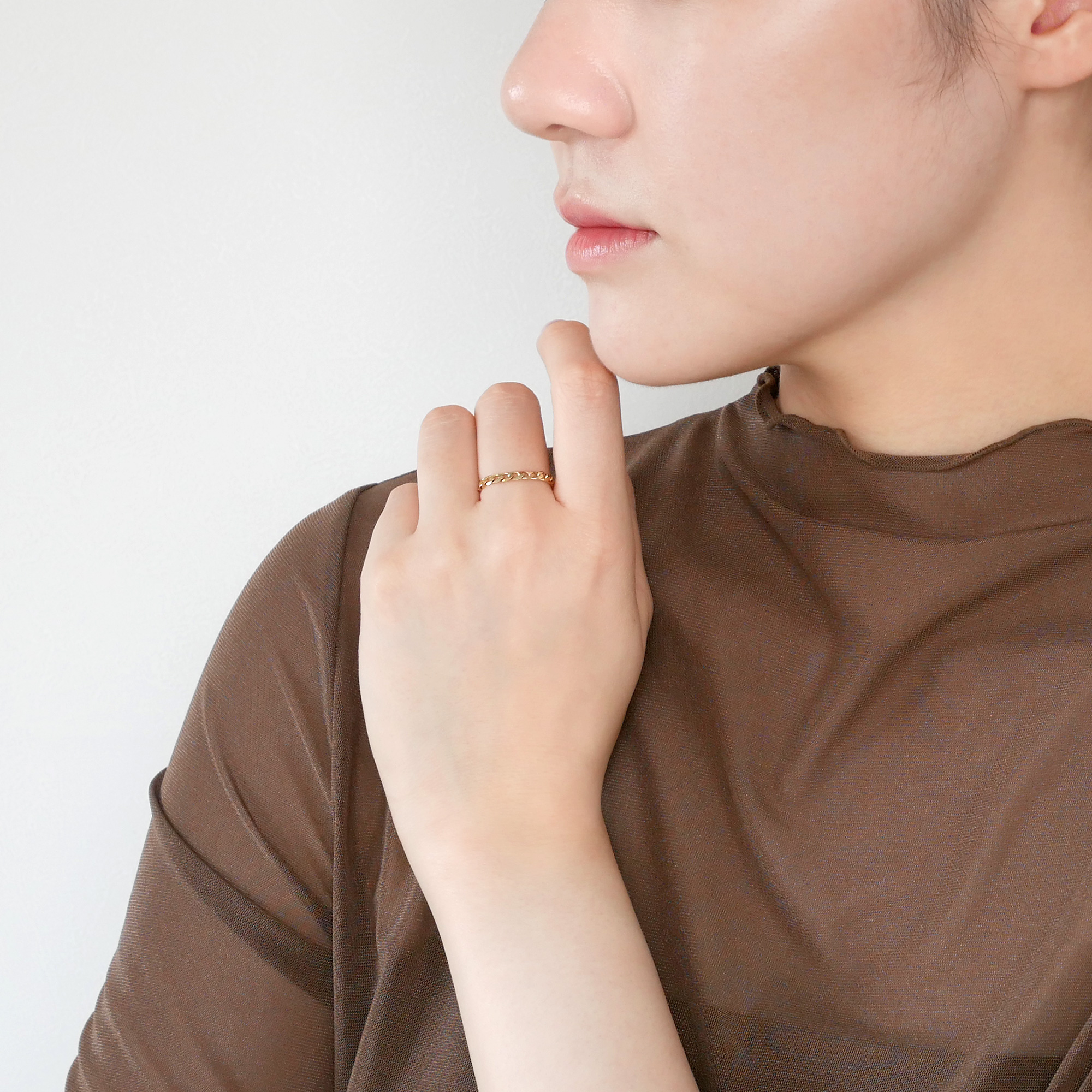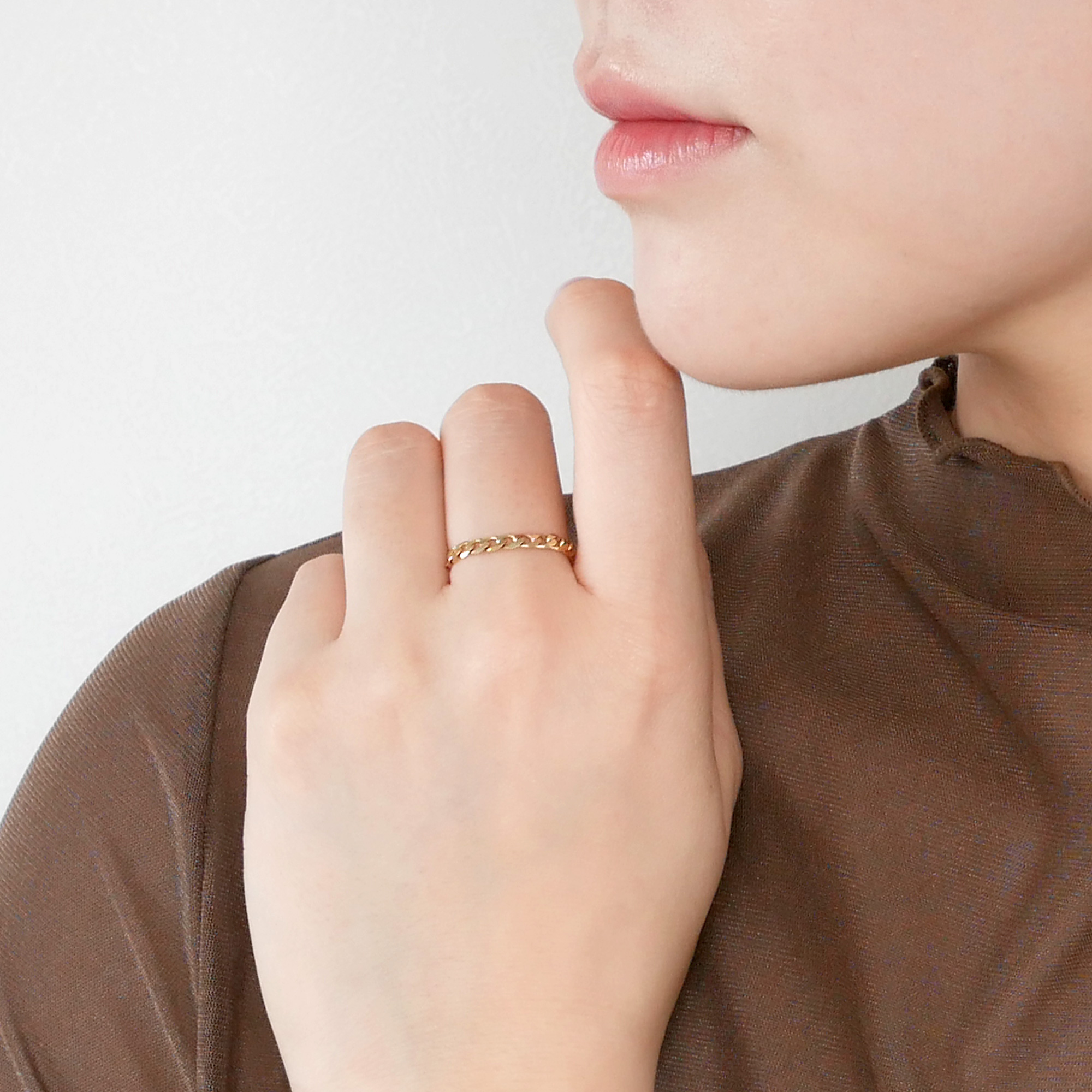 イエローゴールドの煌めきが手元に華やかさをプラスするリングは、コーディネートアイテムとしてもおすすめ。