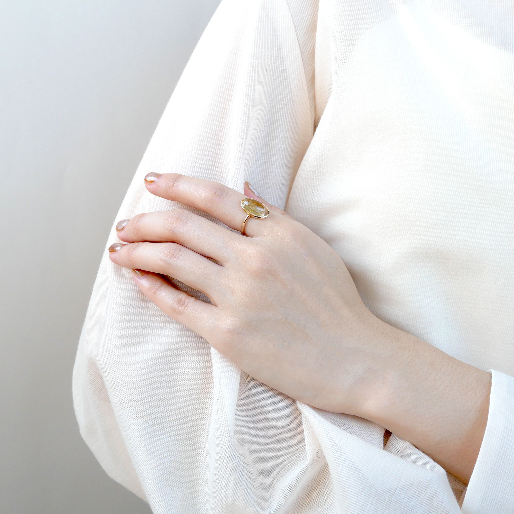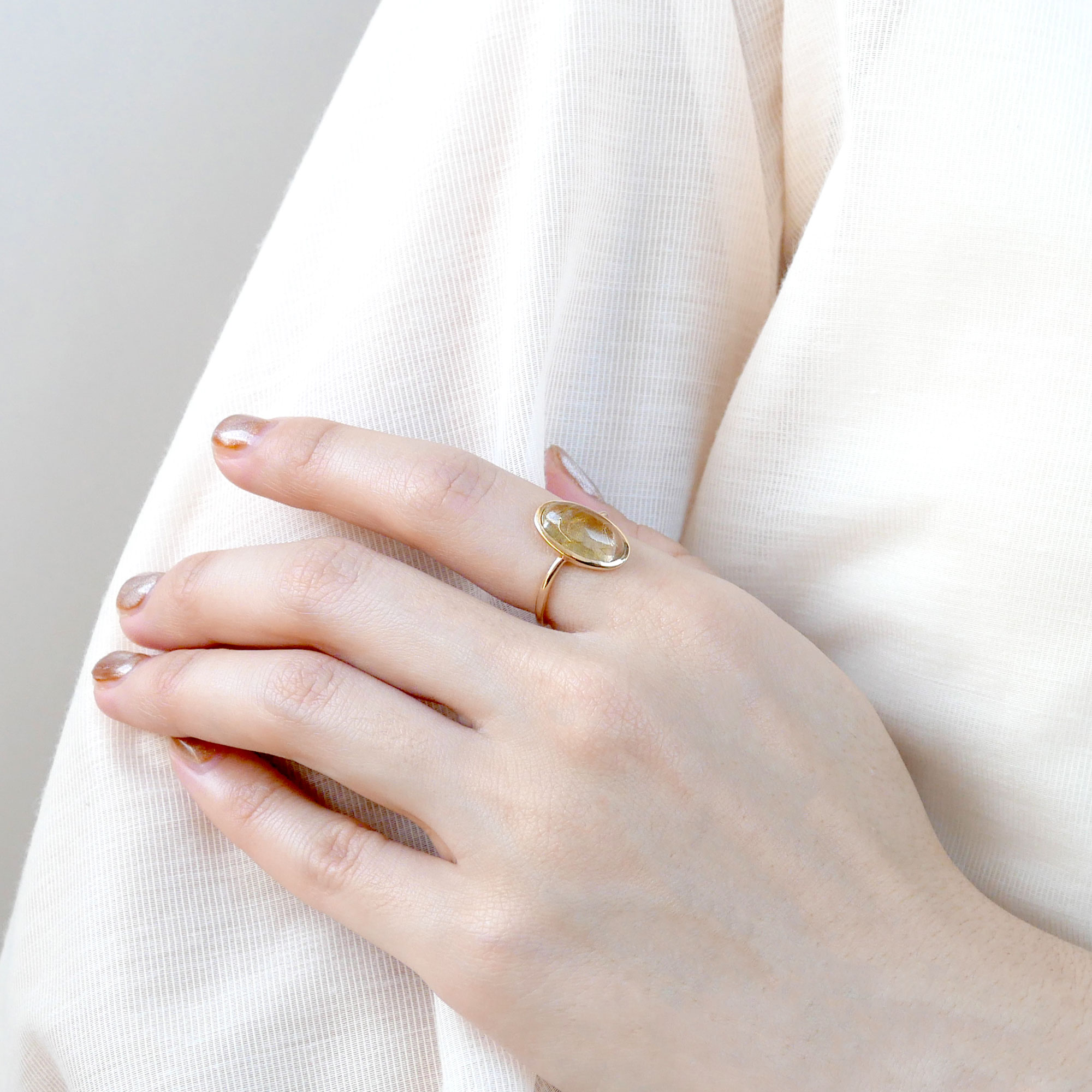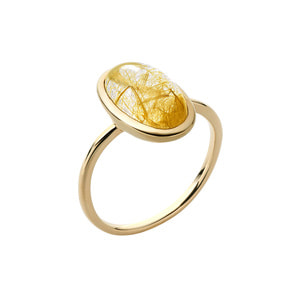 オーバルカボションカットのルチルクォーツをイエローゴールドのラインで縁取りしたリング。