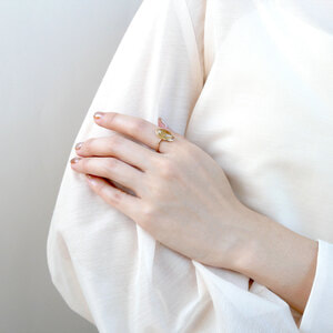 アームは柔らかなカーブを描いた繊細なラインで、艶やかに磨かれた地金の光沢がルチルクォーツの魅力を引き立てます。