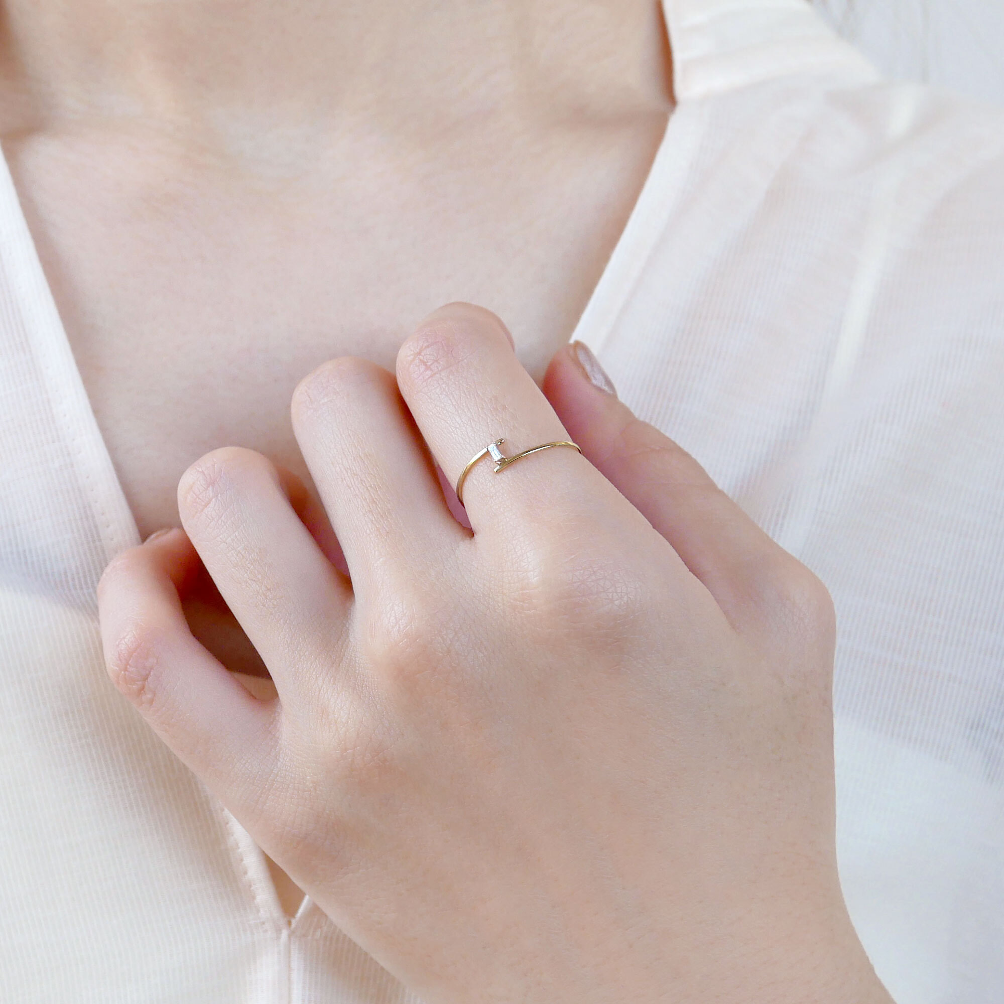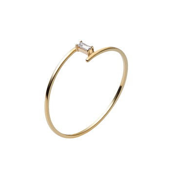ひねりを加えた繊細なリングに、バゲットカットのダイヤモンドがピリッと大人の表情を演出。