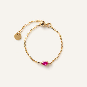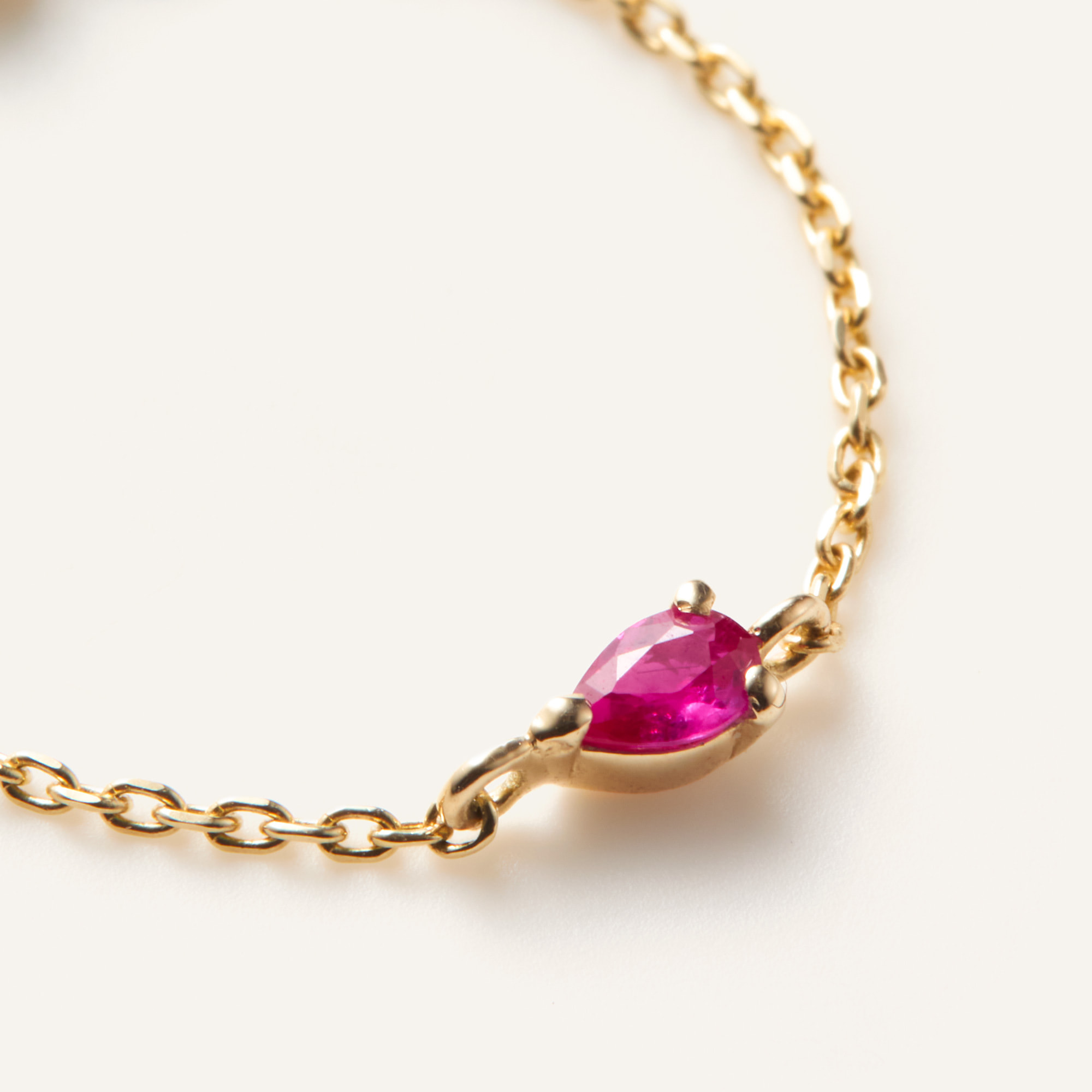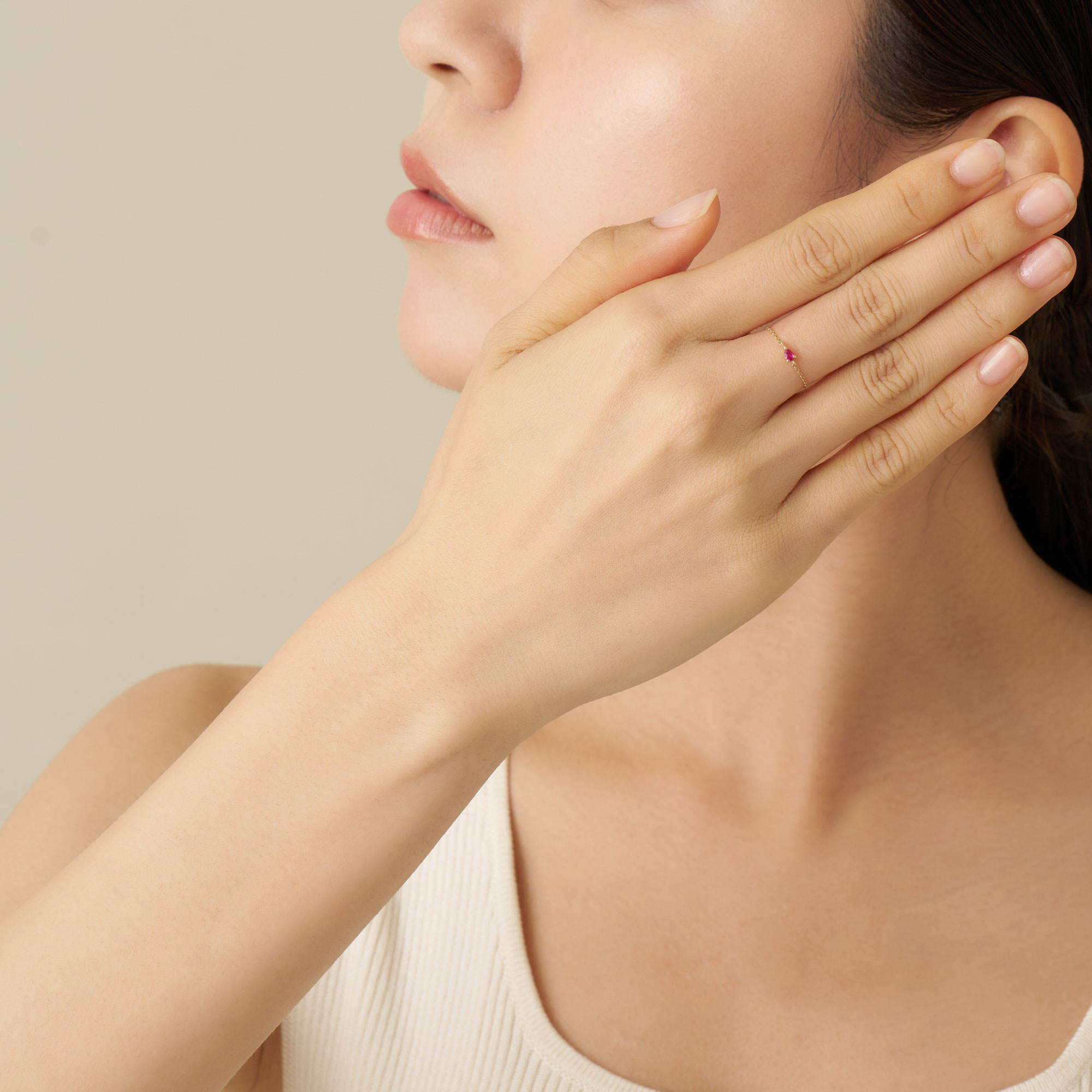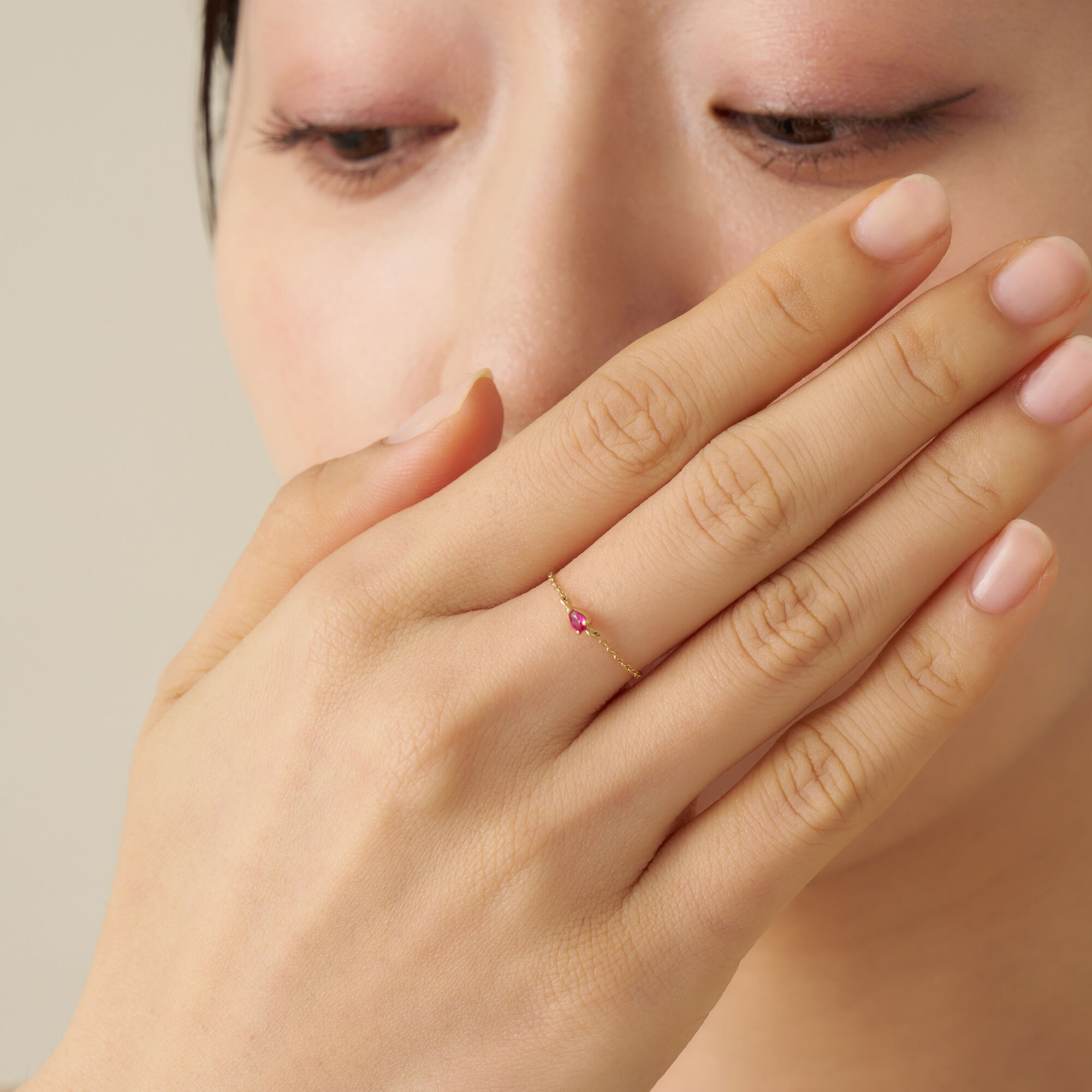 情熱的な色あいが目を惹くルビーが手元で印象的に輝くチェーンリング。