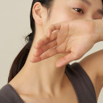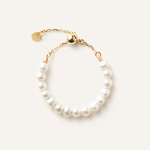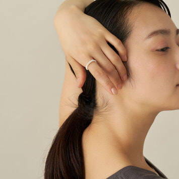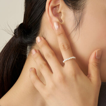 シンプルな一筋のパールのチェーンリングは、柔らかく明るい光で手元をきれいに見せてくれます。
