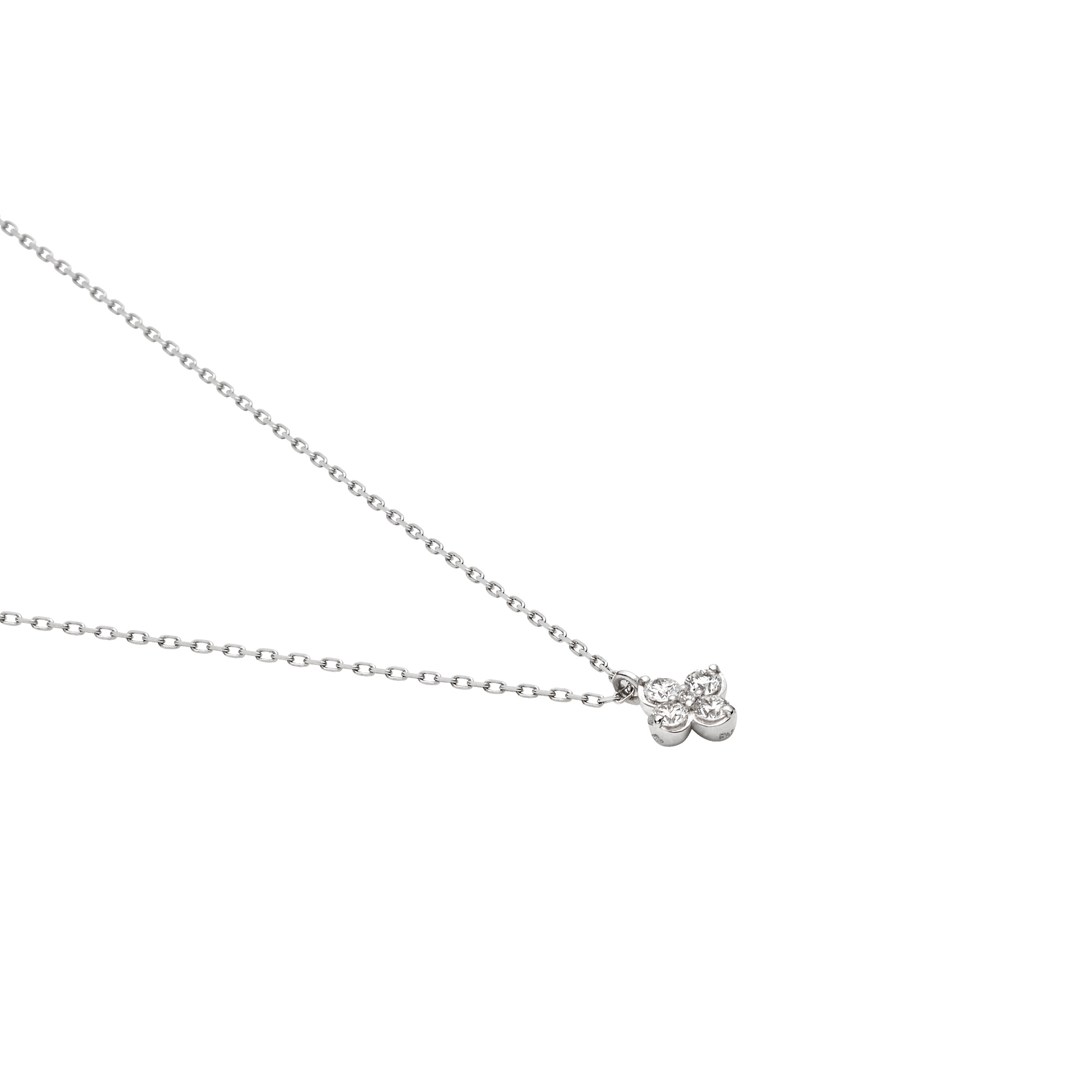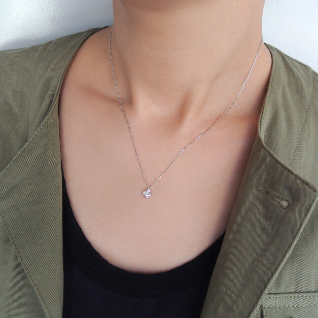チェーンはすっきりとしたV字のラインを描き、花モチーフでありながら甘くなりすぎずクリーンな印象に。