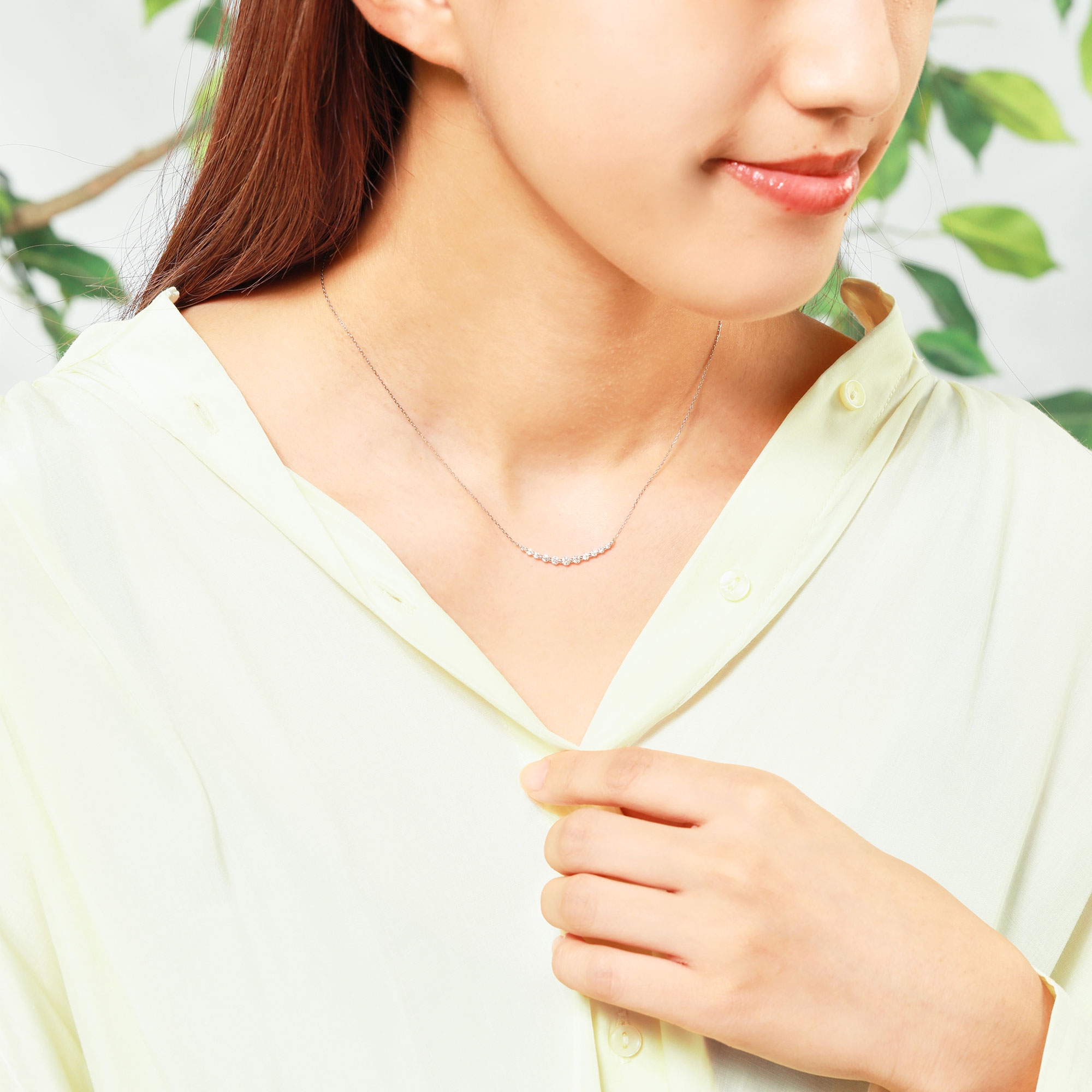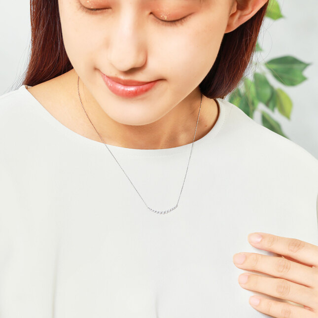 艶やかなプラチナとダイヤモンドの輝きは、胸元に大人っぽい印象をプラス。