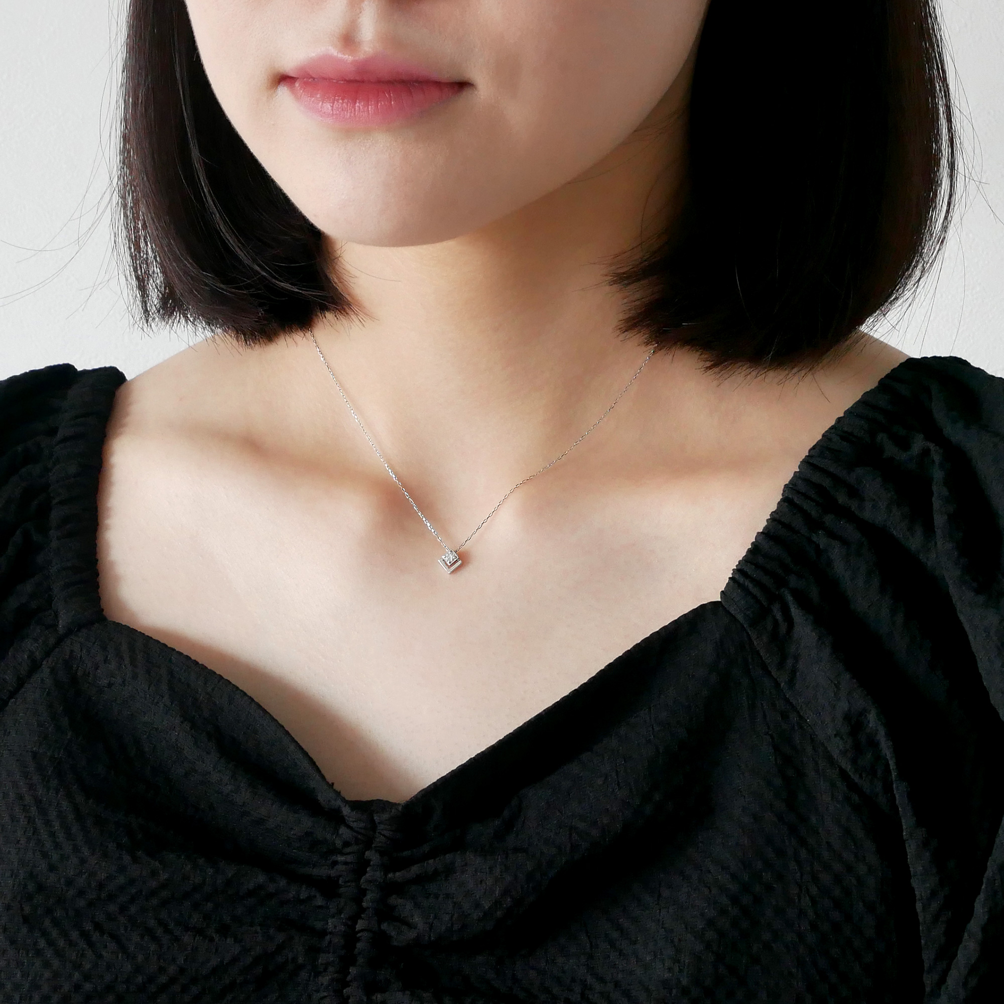 ダイヤモンドはキューブ状のフラットな面に1石留められ、ダイヤモンドならではの強い輝きを感じられます。