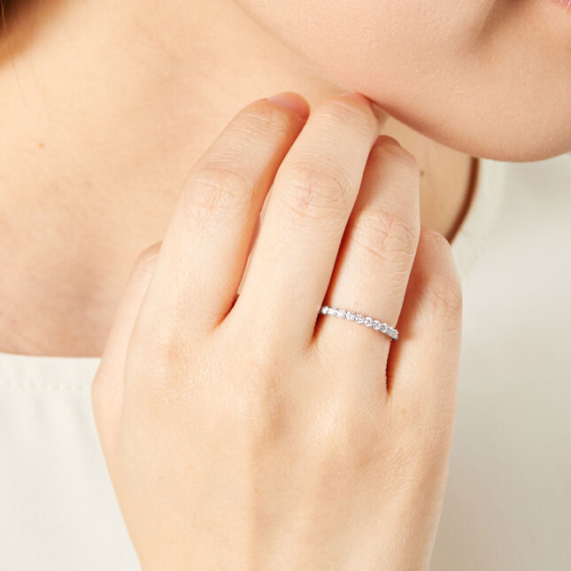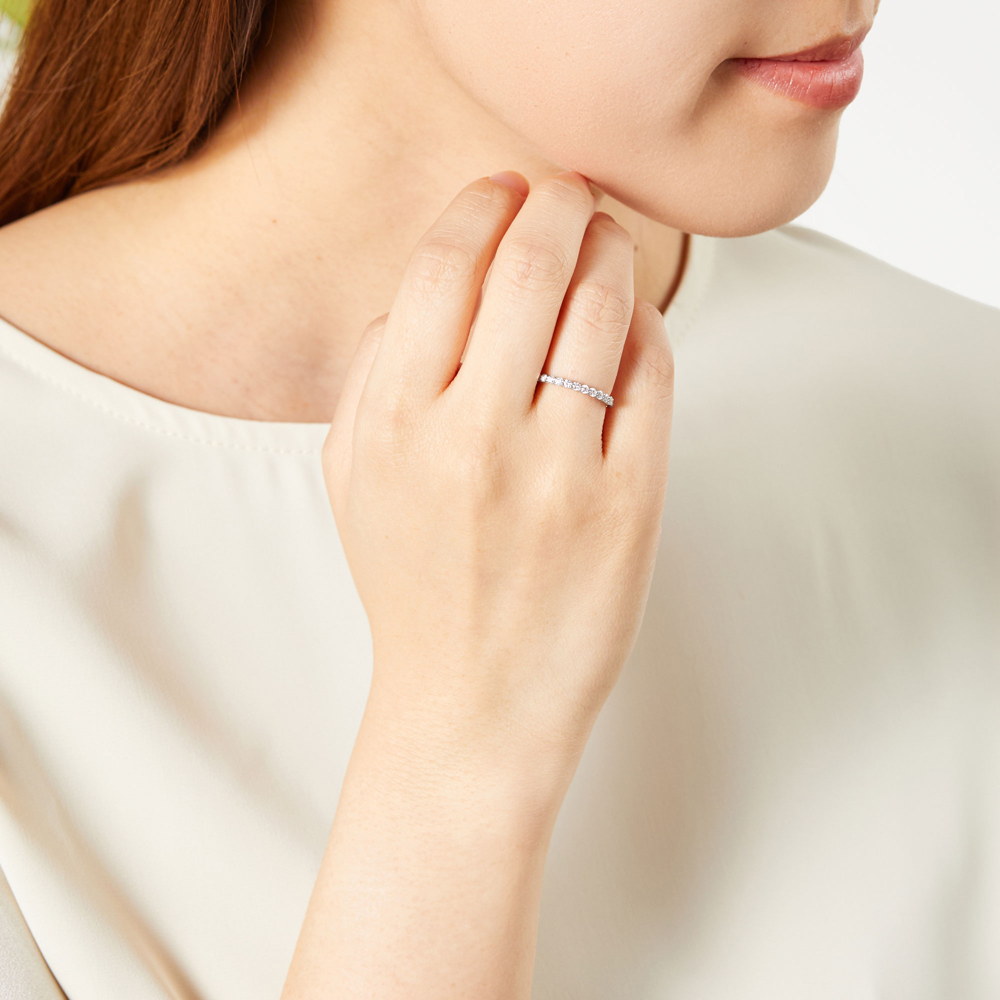 流行に左右されない定番スタイルとして、万能なコーディネート力をもつハーフエタニティリング。