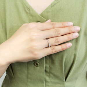 地金と面一に留められたダイヤモンドは引っかかりもなく日常使いしやすいのが魅力。