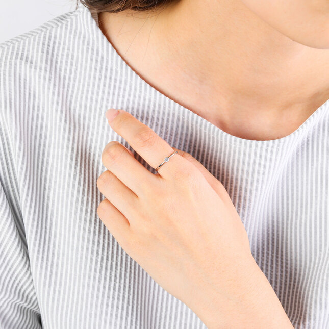 星の瞬きのようにきらめく、一粒ダイヤモンドのリング。ダイヤモンドに向かってきゅっと絞られたデザインが、繊細な雰囲気です。