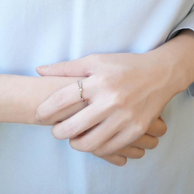 流線形でV字のフォルムが指を長くきれいに見せ、プラチナの白い輝きと繊細なディテールが華奢で女性らしい手元に。