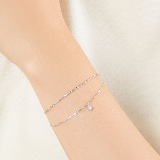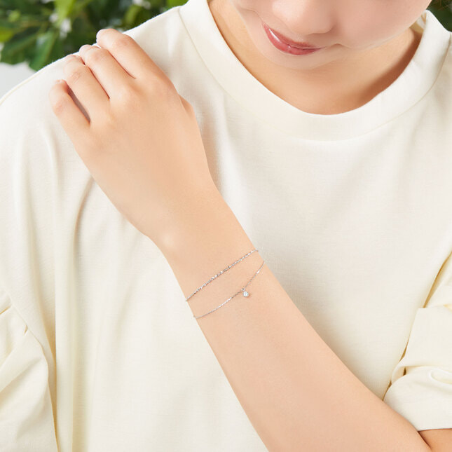 異なる2種類のチェーンが手首できらきらと輝くブレスレット。