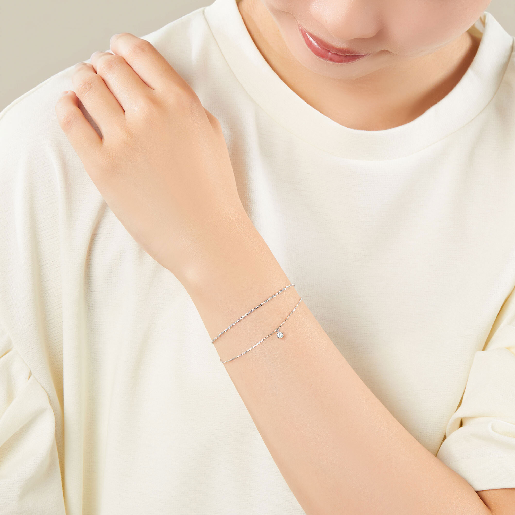 異なる2種類のチェーンが手首できらきらと輝くブレスレット。