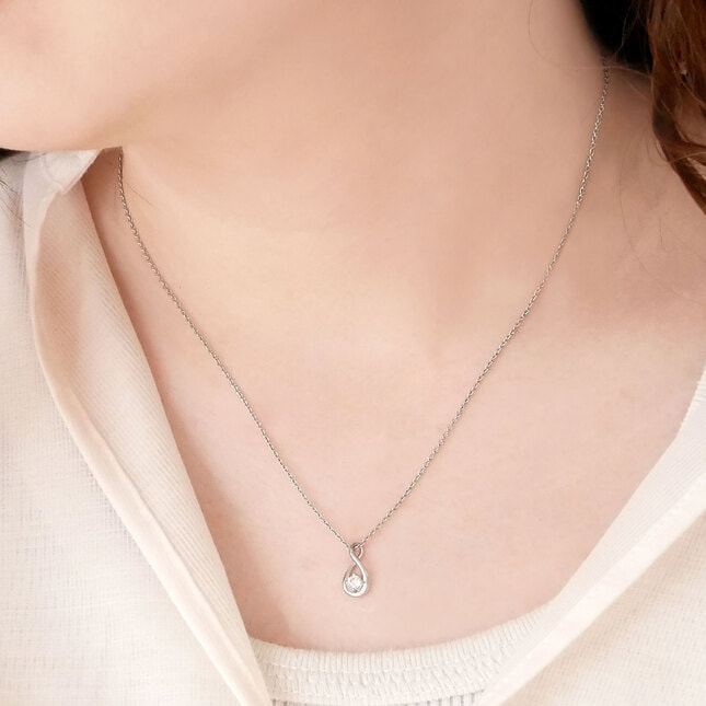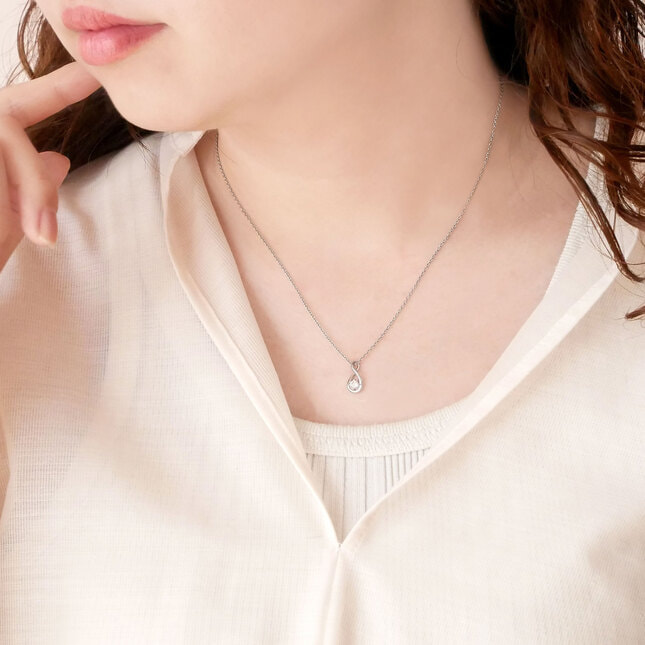 白く輝くシルバーがさわやかな印象の、ドロップモチーフのネックレス。