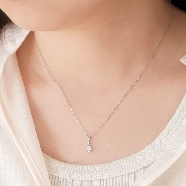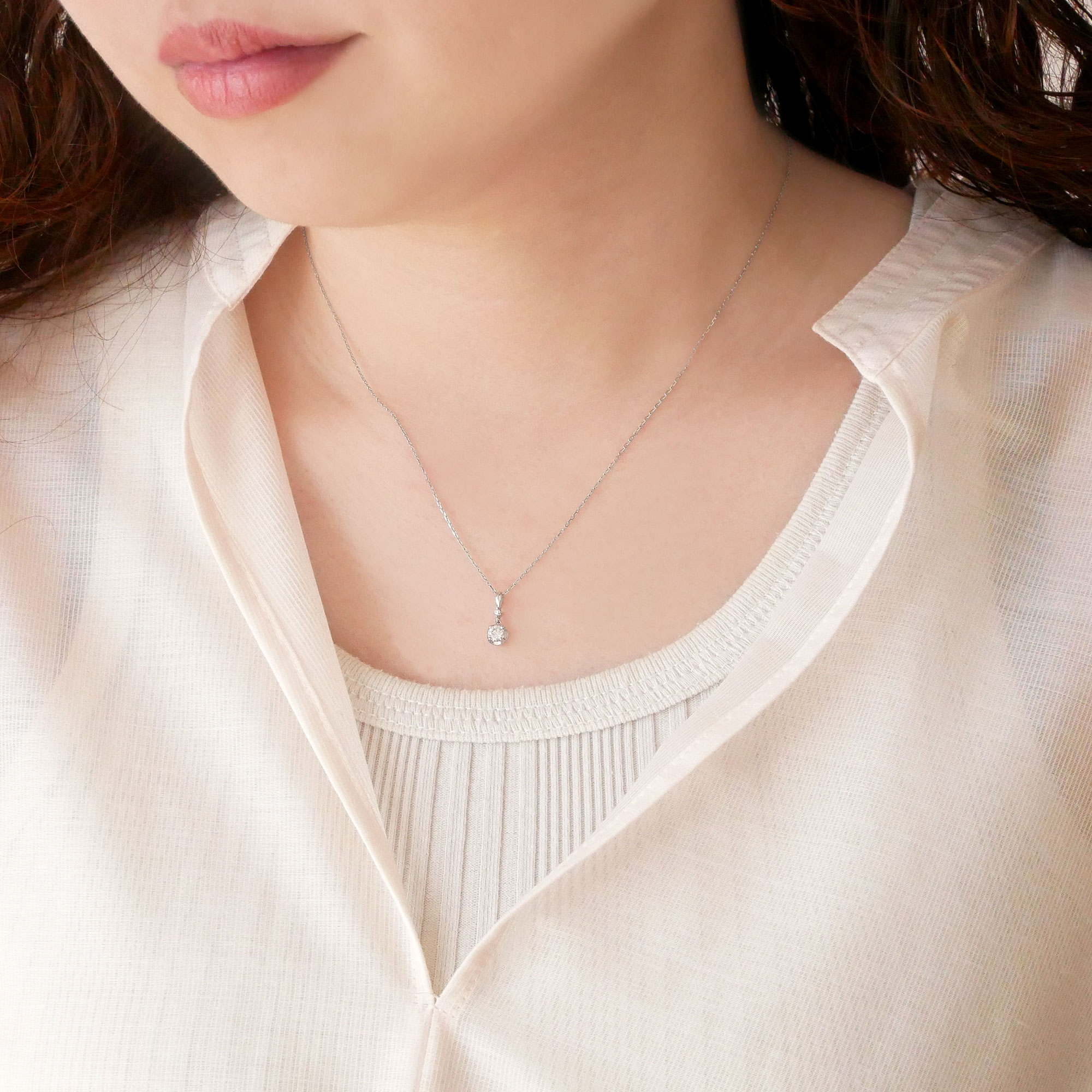 シルバーのつやが胸元を明るく爽やかに見せ、みずみずしい輝きを放つキュービックジルコニアを引き立てています。
