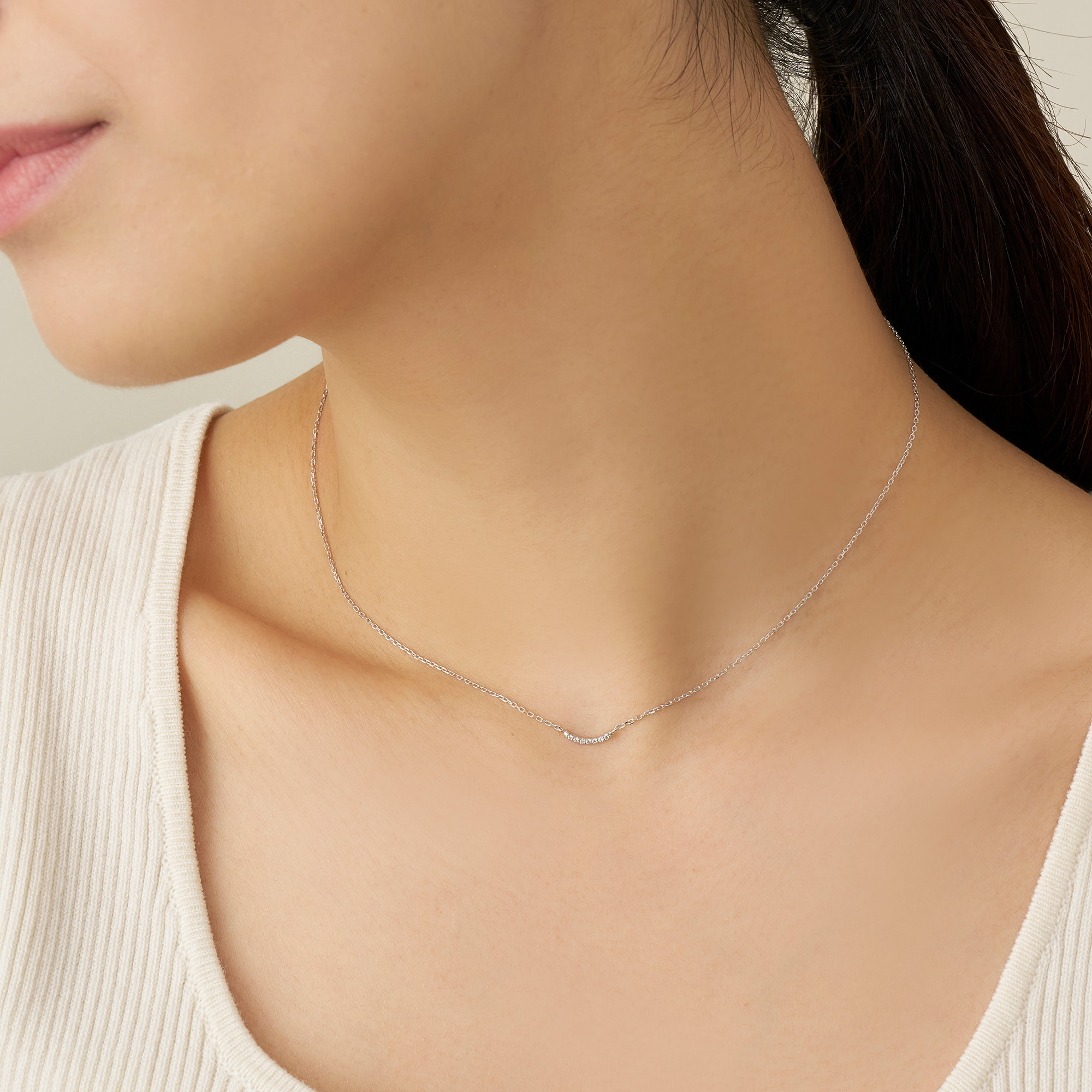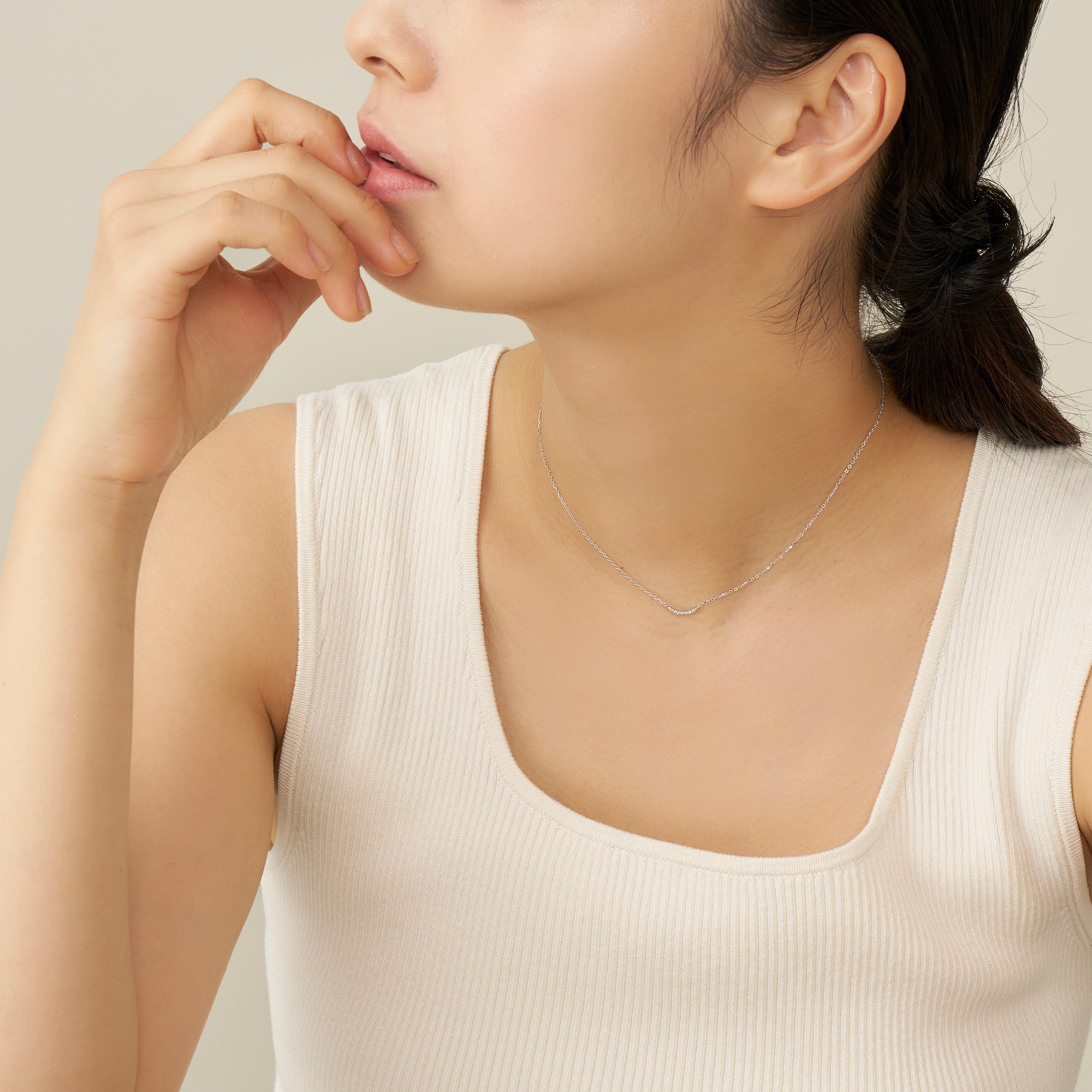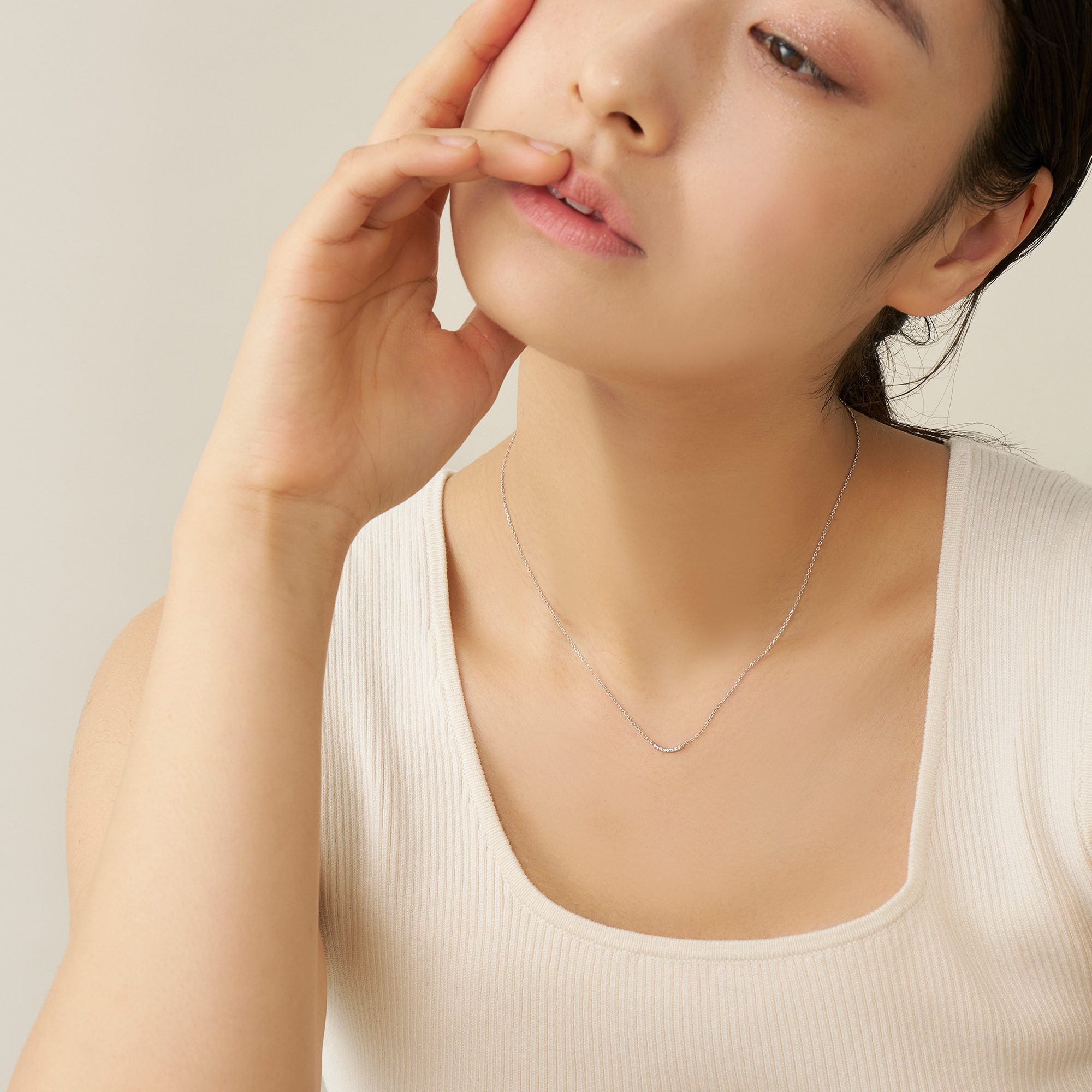 シンプルなデザインのネックレスは、オンオフ問わず様々なシーンで活躍しそう。