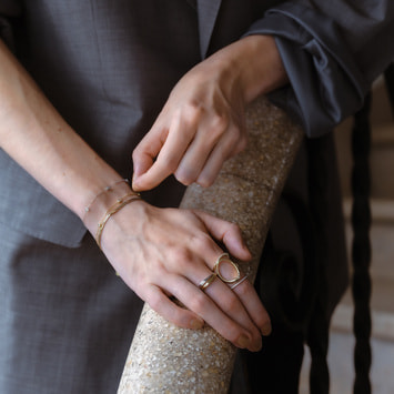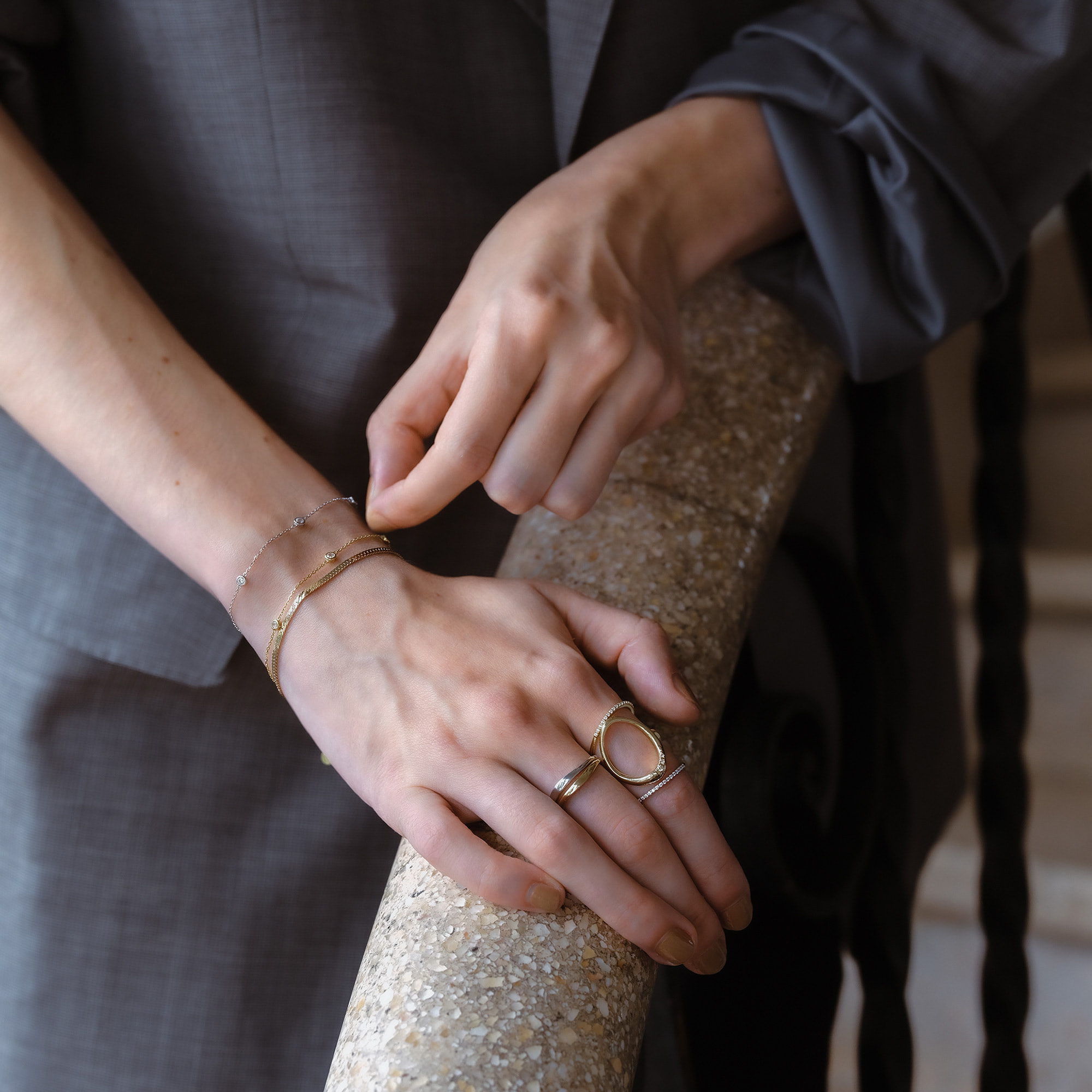 ストレートのライン上に小さなキュービックジルコニアをあしらい、手元に繊細なきらめきをプラス。