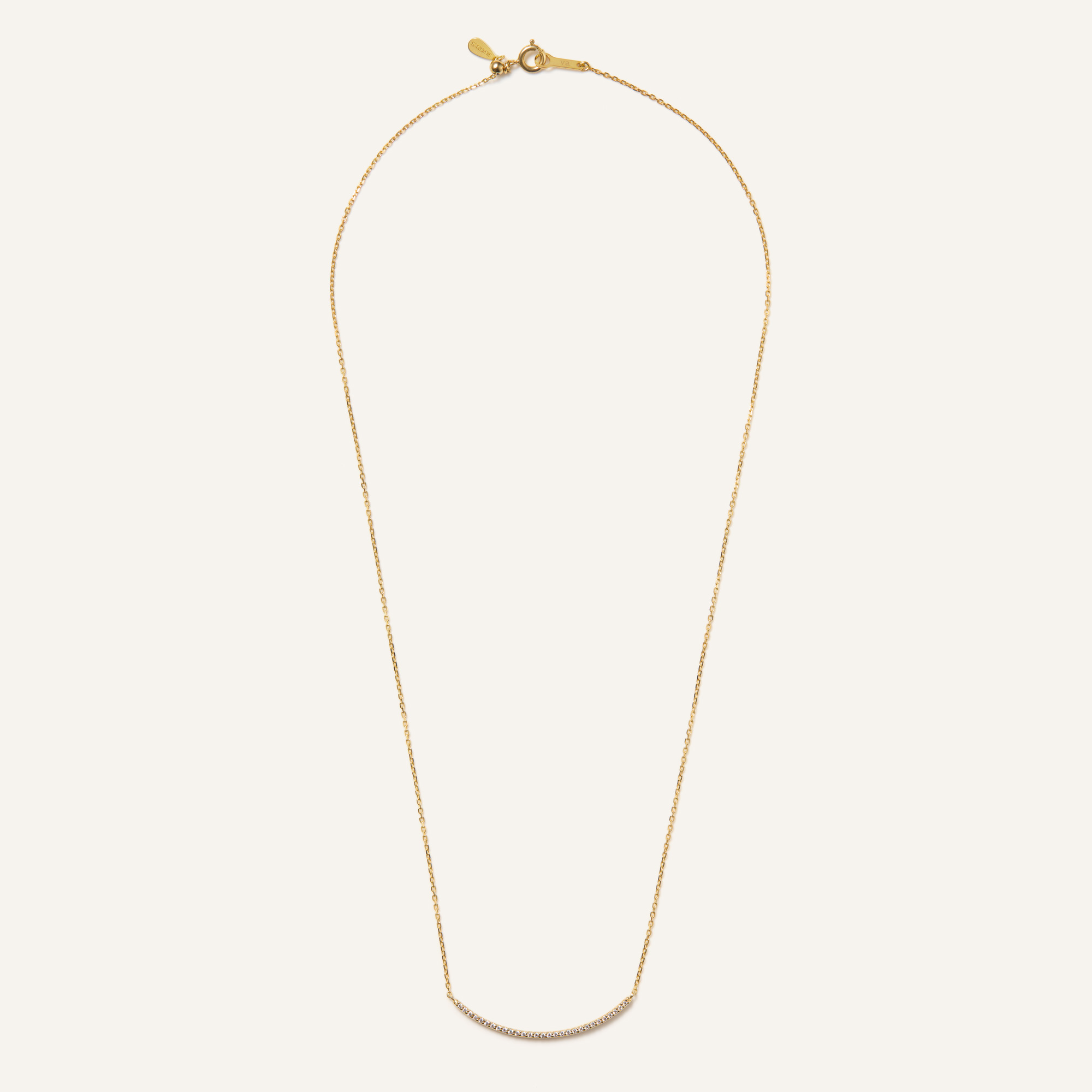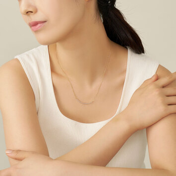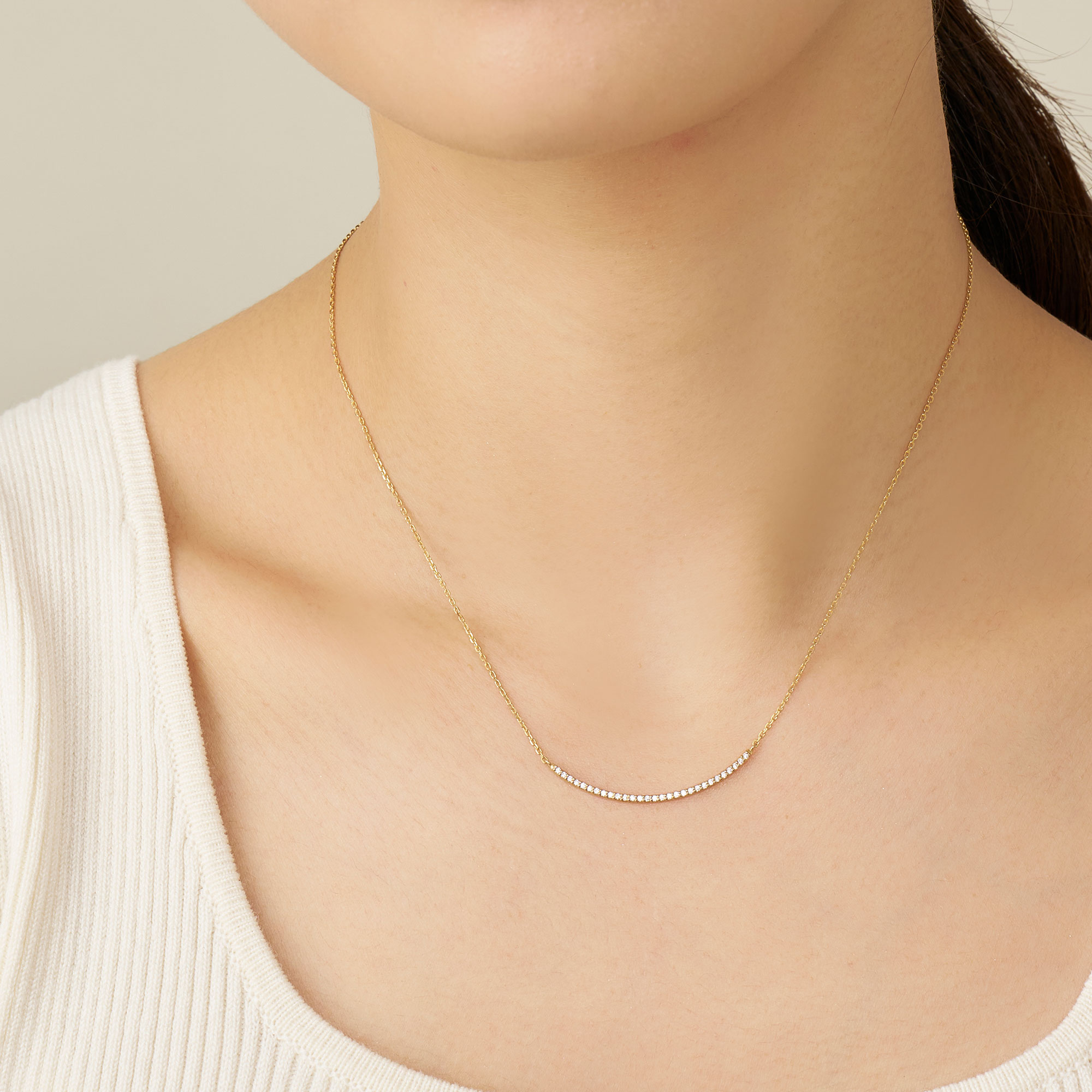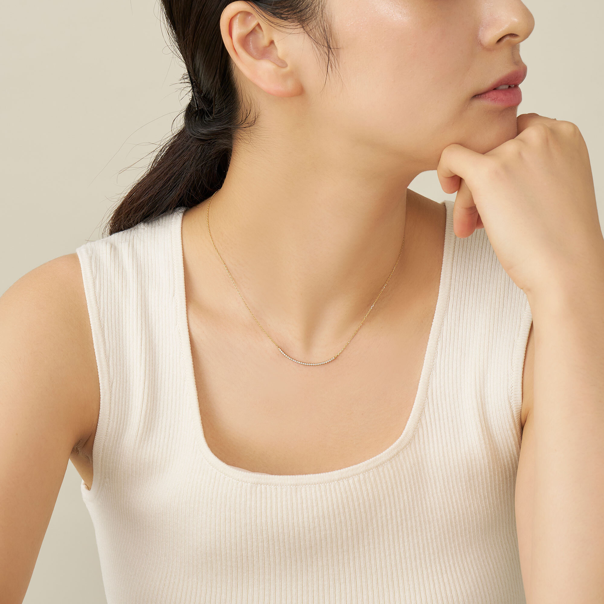 シンプルなデザインのネックレスは、オンオフ問わず様々なシーンで活躍しそう。