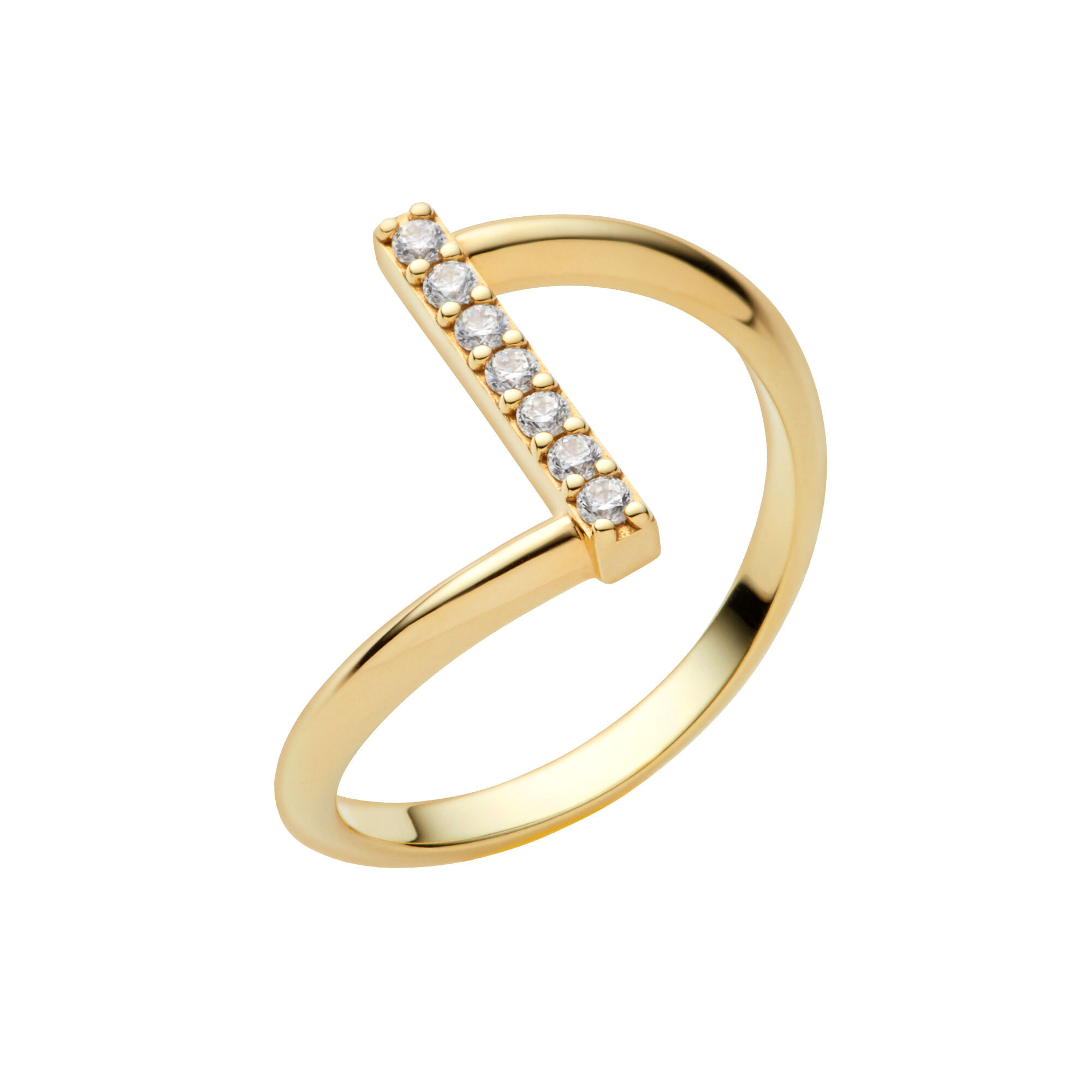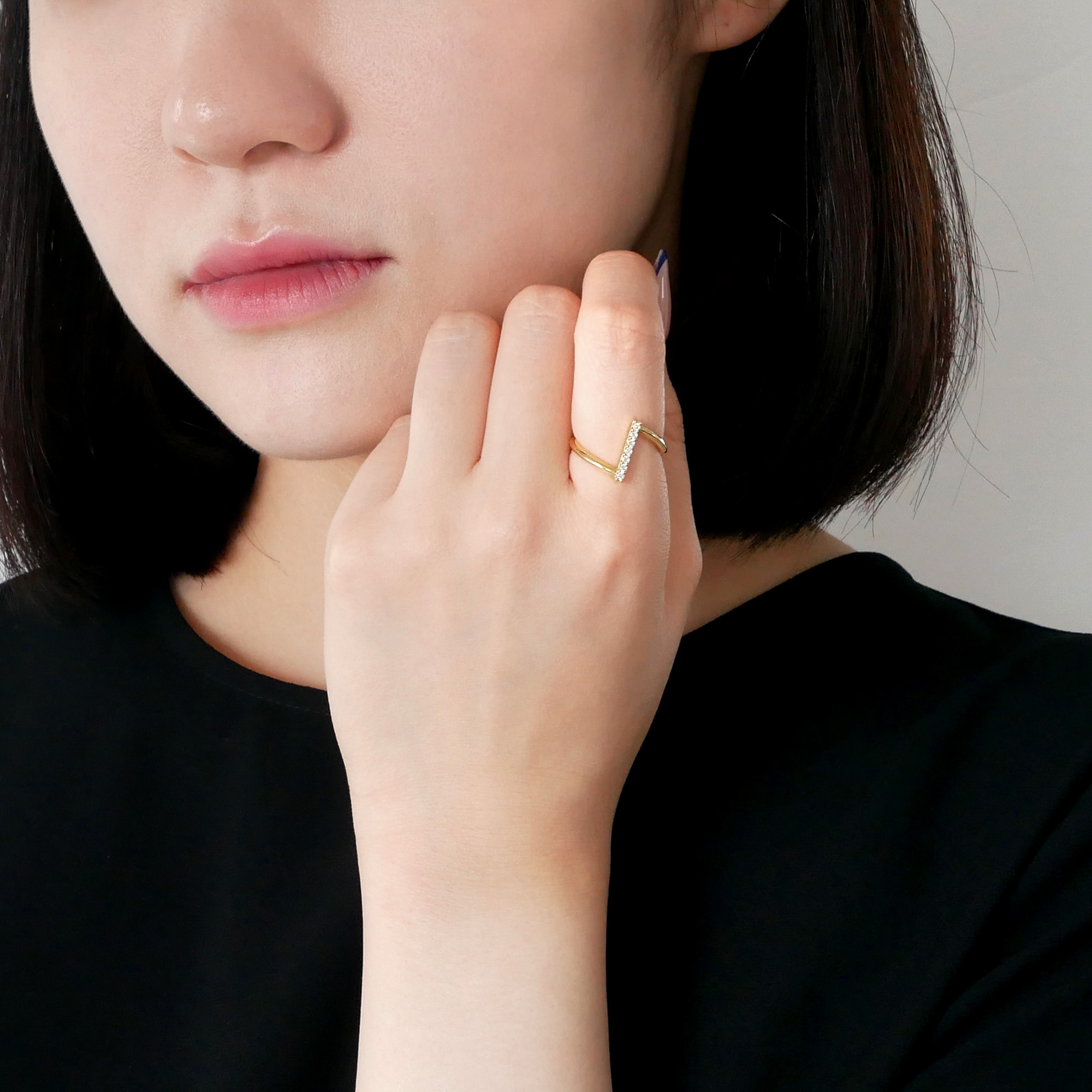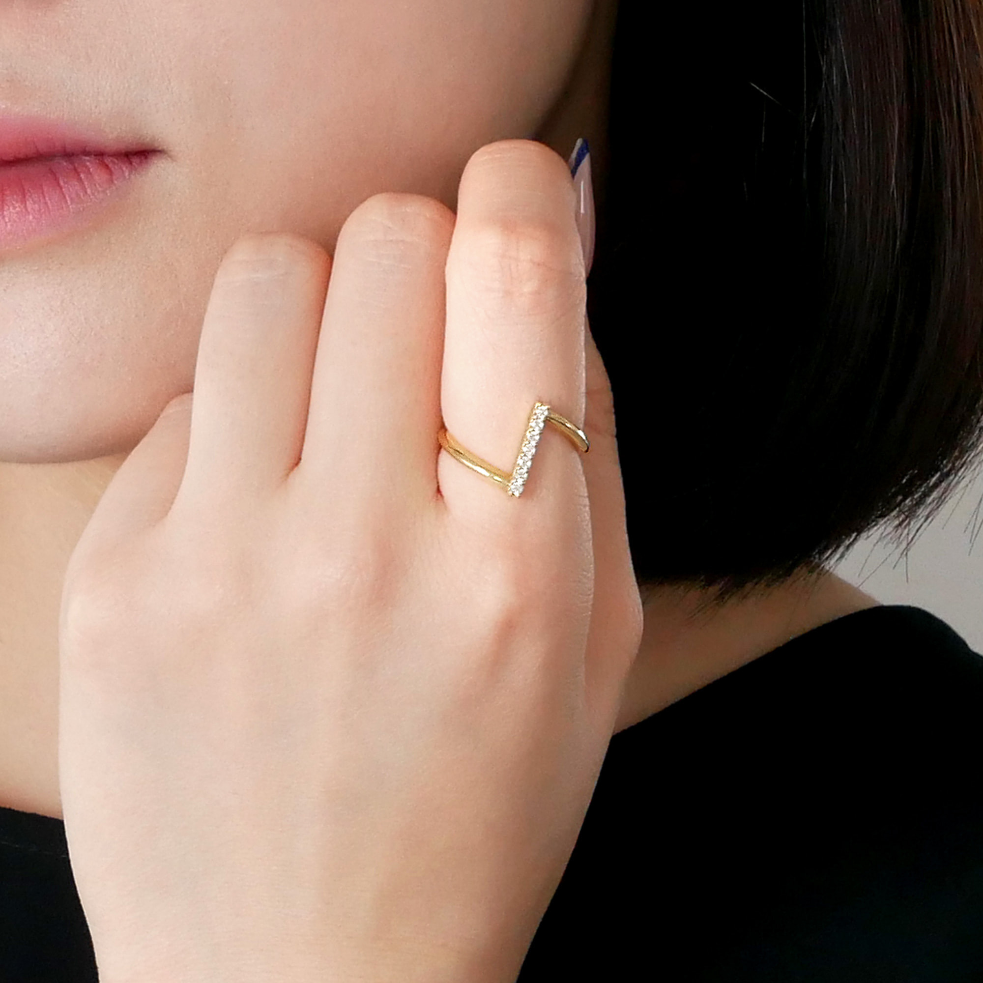キュービックジルコニアがセッティングされたトップの直線と腕部分の滑らかな曲線の対比が美しいリング。