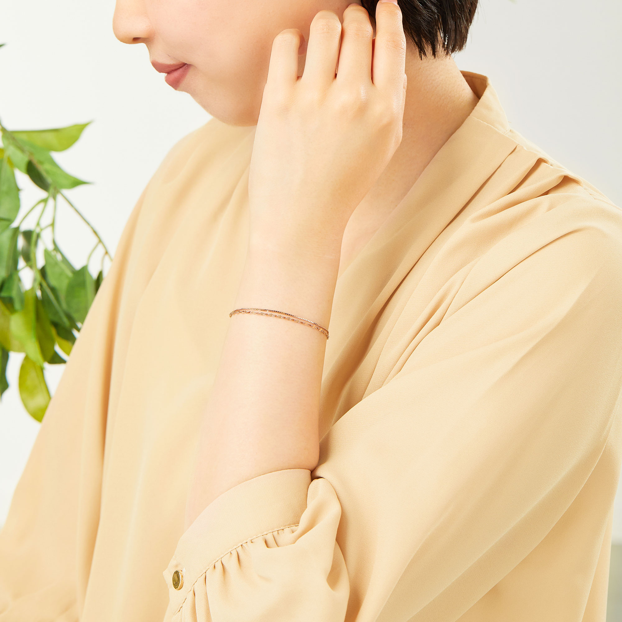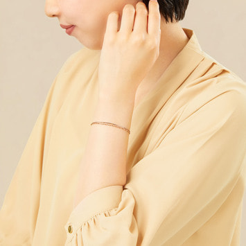艶のあるチェーンと花びらのようなチェーンが2連になっていて、チェーンが動くたびに輝き、繊細で女性らしい手元に。
