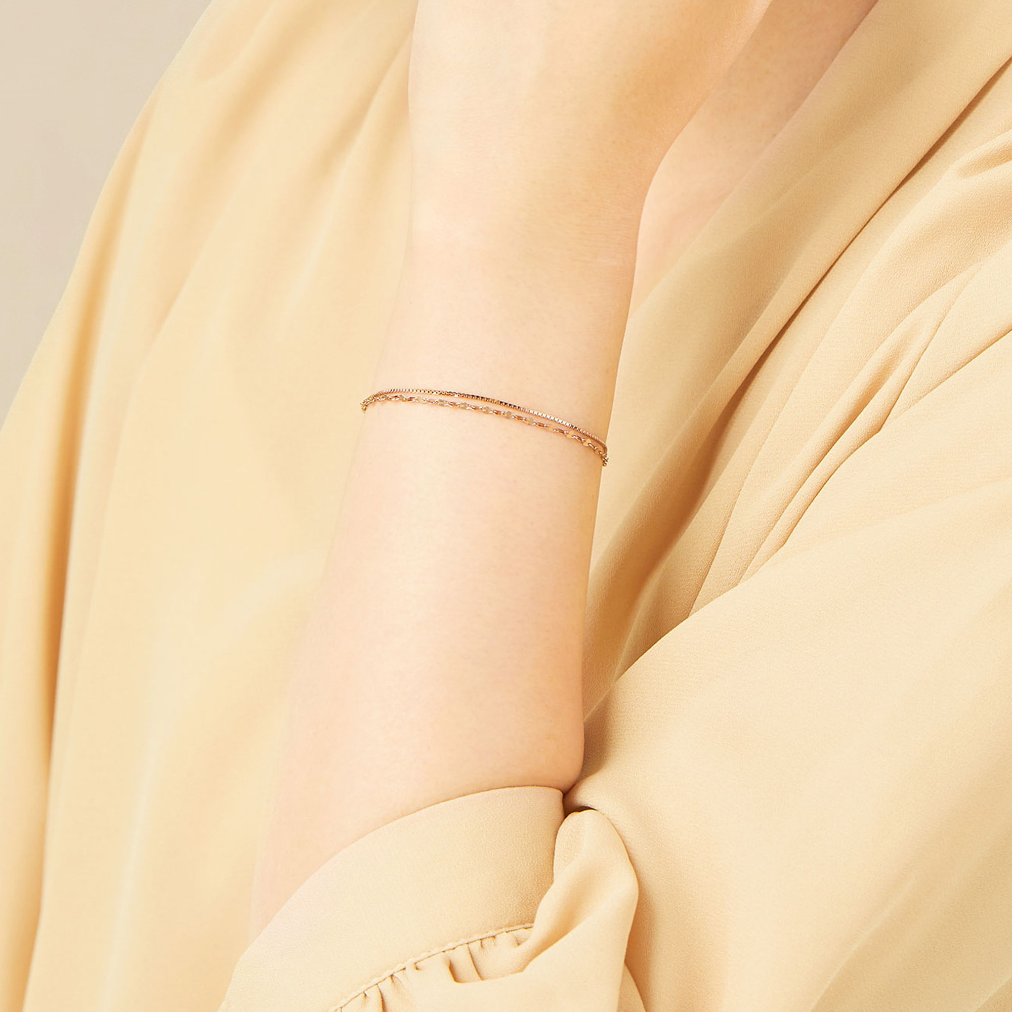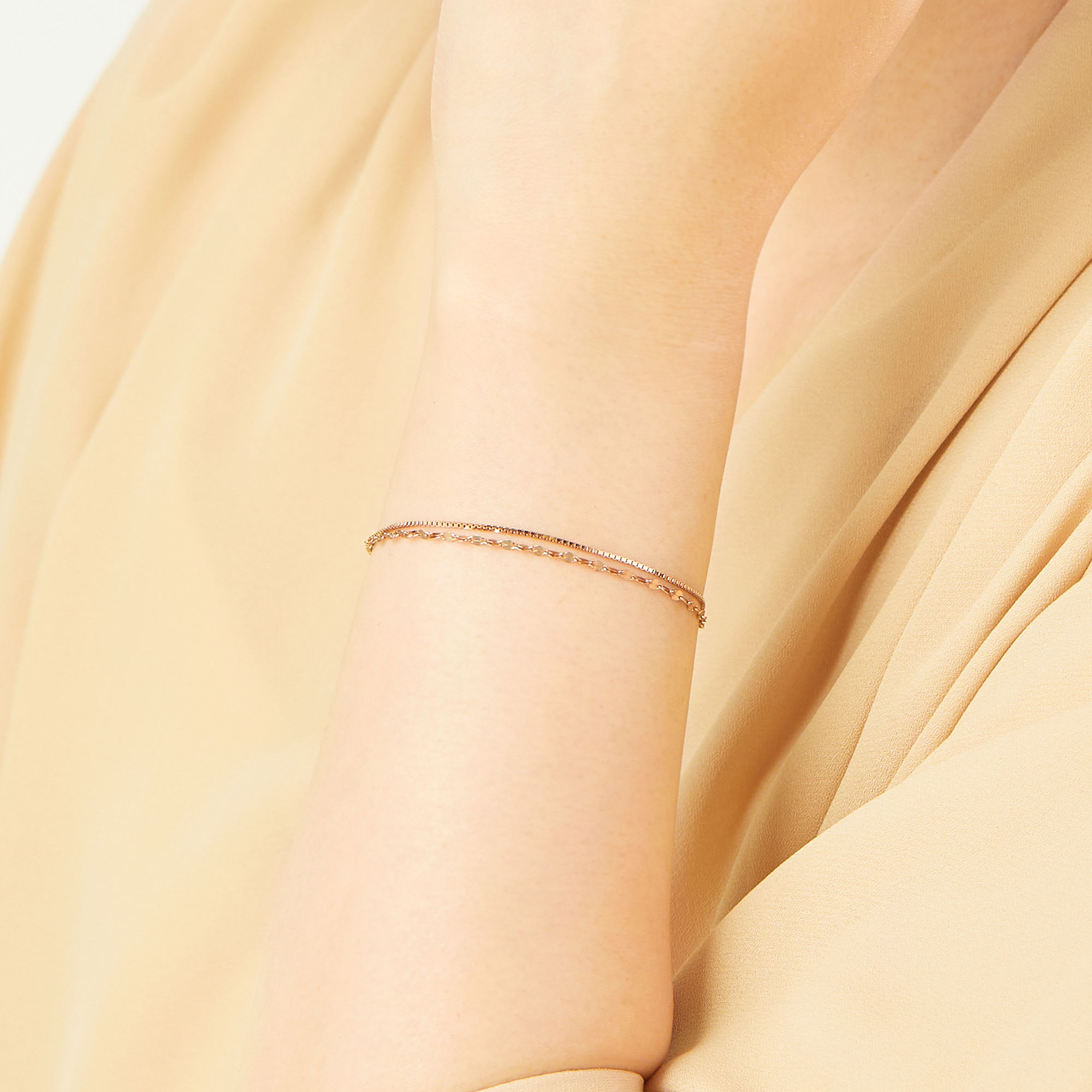 異なる2種類のチェーンが手首できらきらと輝くブレスレット。