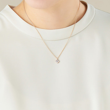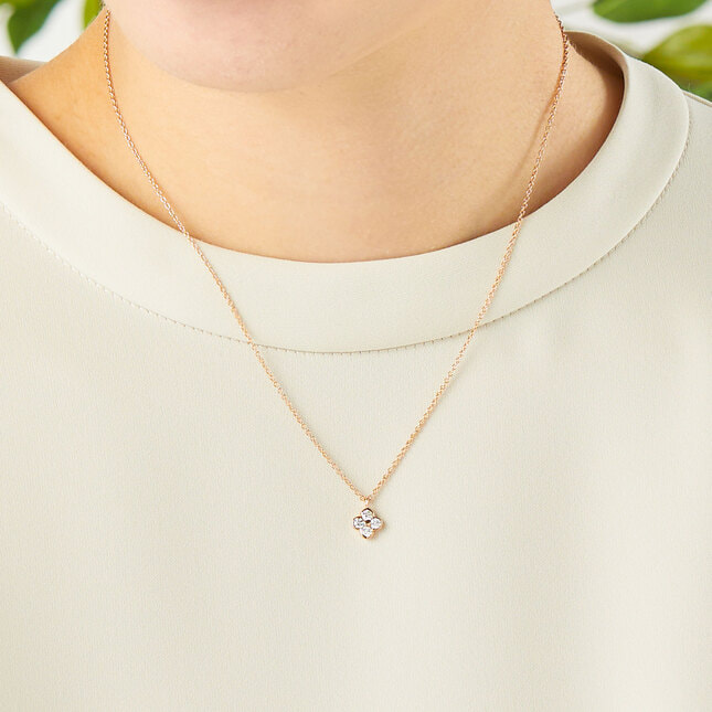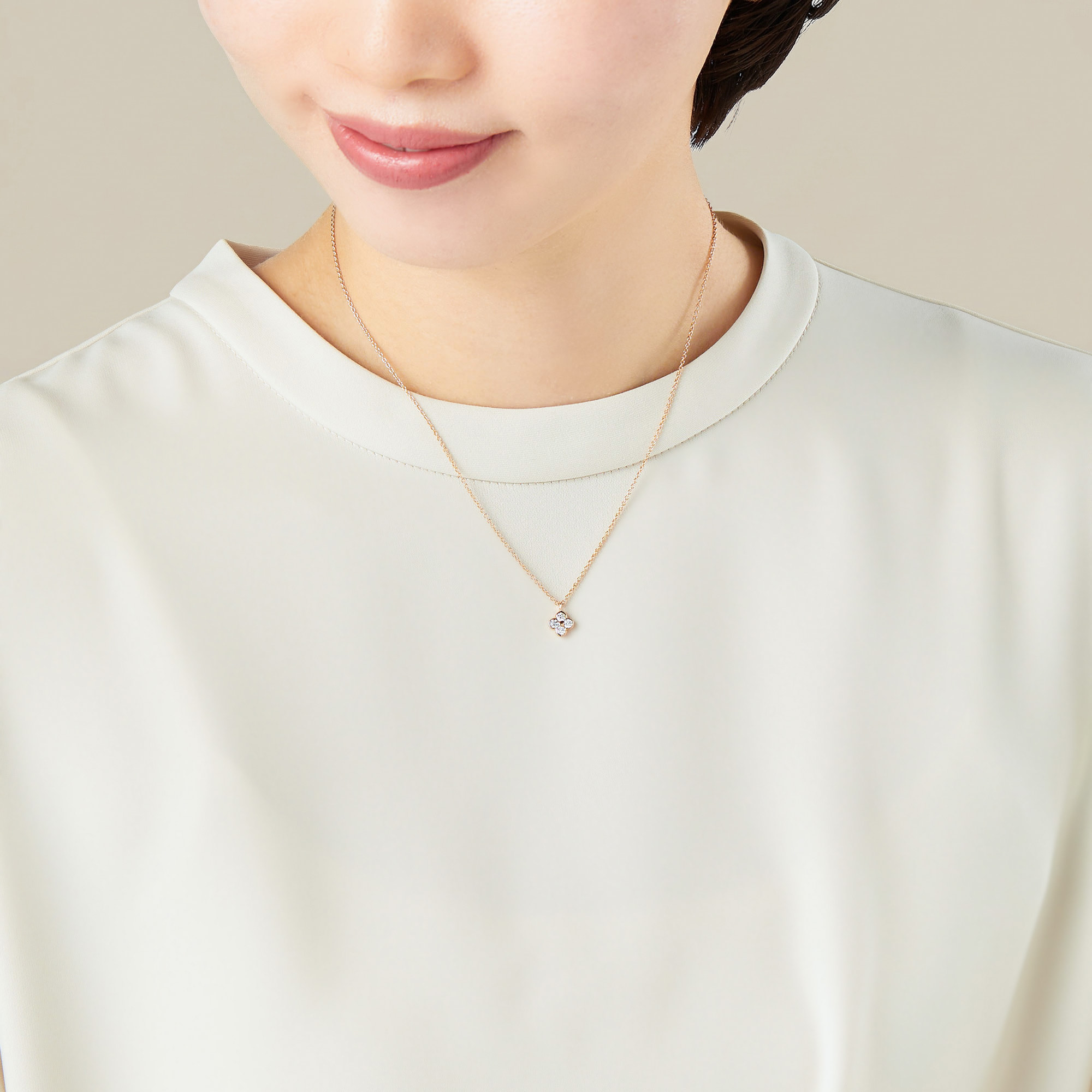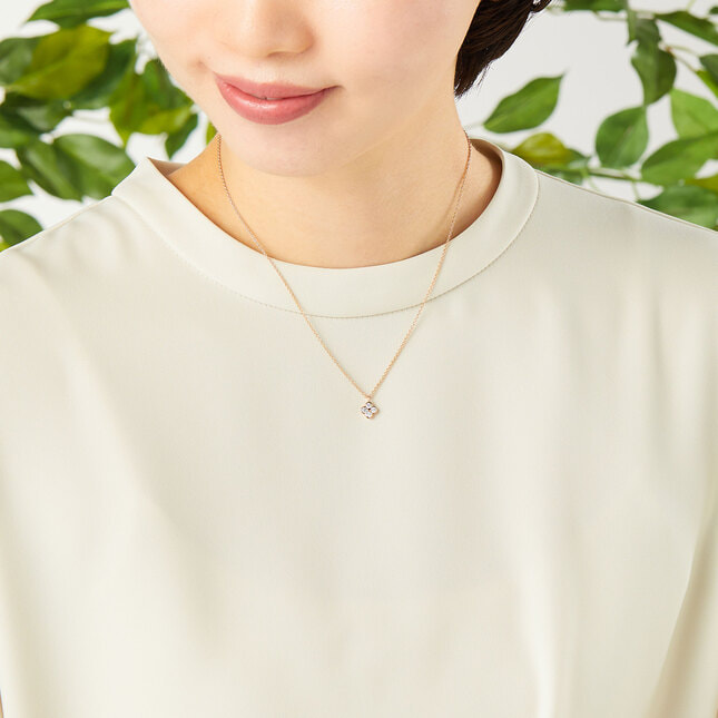 4枚の花びらが胸元できらきらと輝きを放ち、大人っぽい可愛さを演出します。