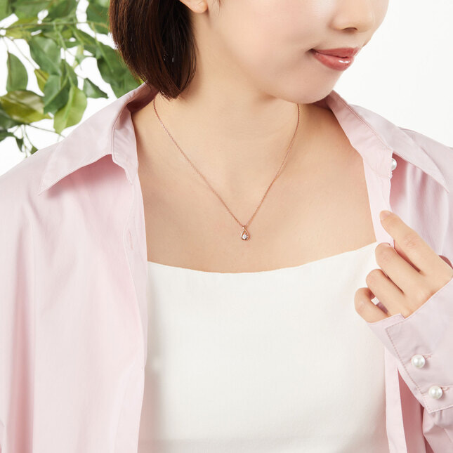 肌馴染みの良いピンクゴールドカラーの、ドロップモチーフのネックレス。