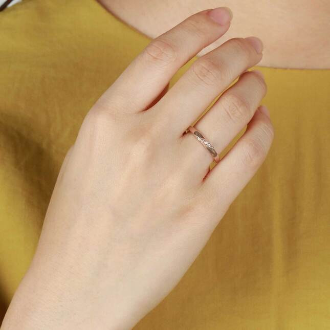 なめらかなピンクゴールドのアームに、ななめにキュービックジルコニアを配したリング。