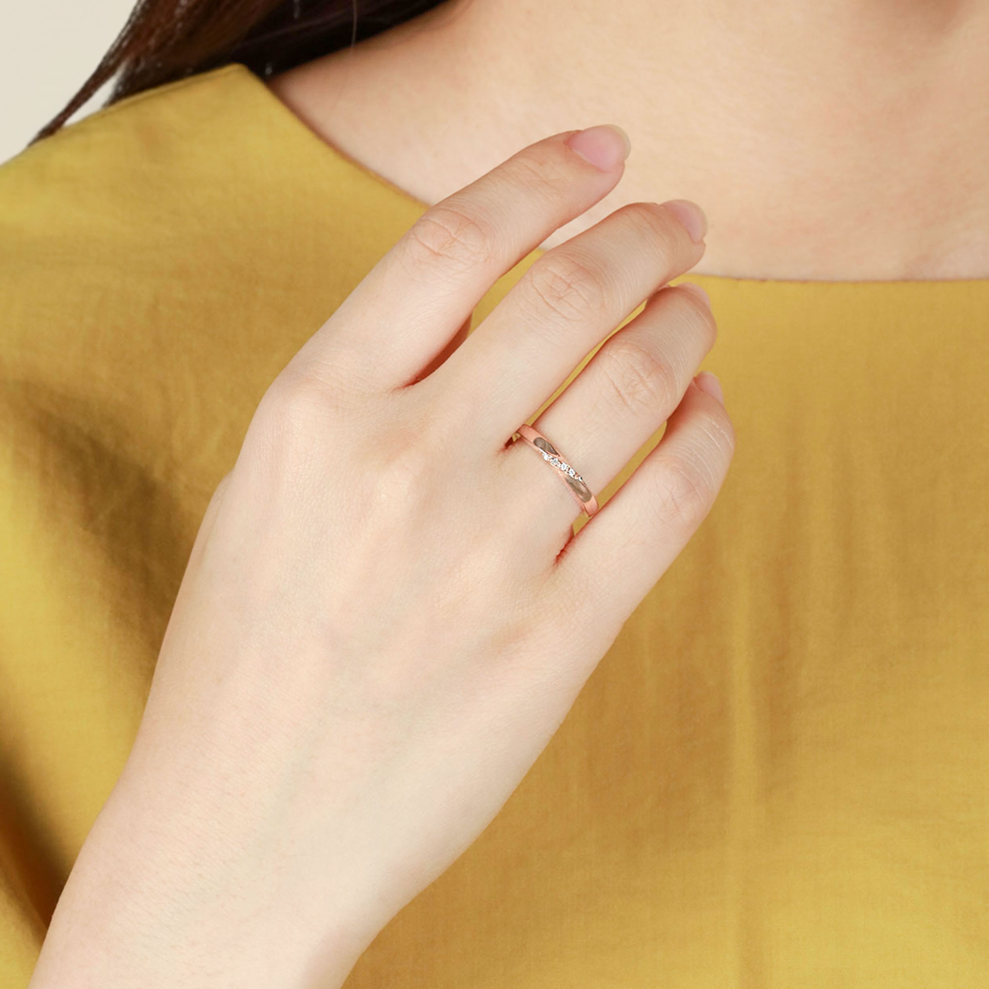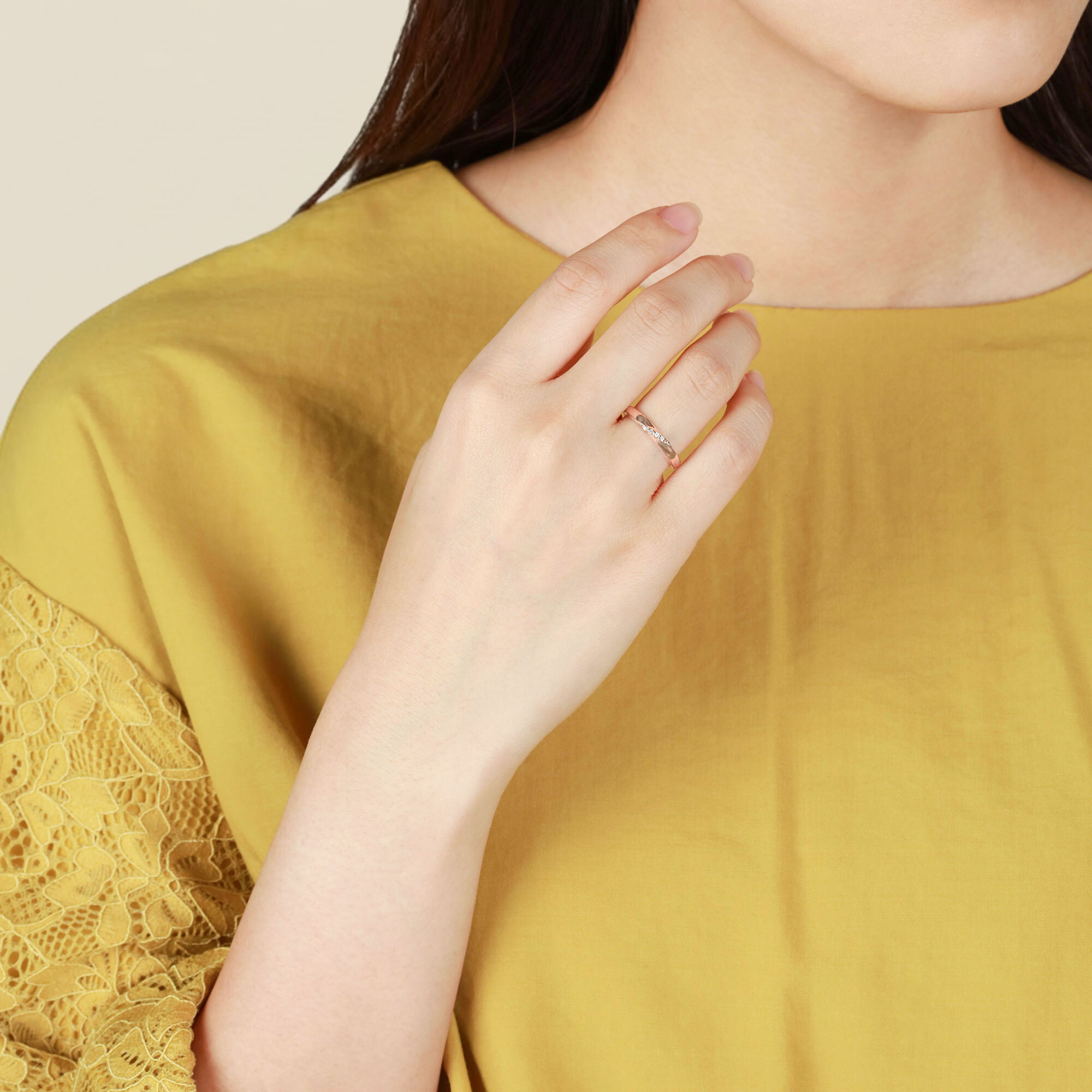 ストレートなシルエットなのでエタニティリングと重ねてボリュームアップするのもおすすめ。