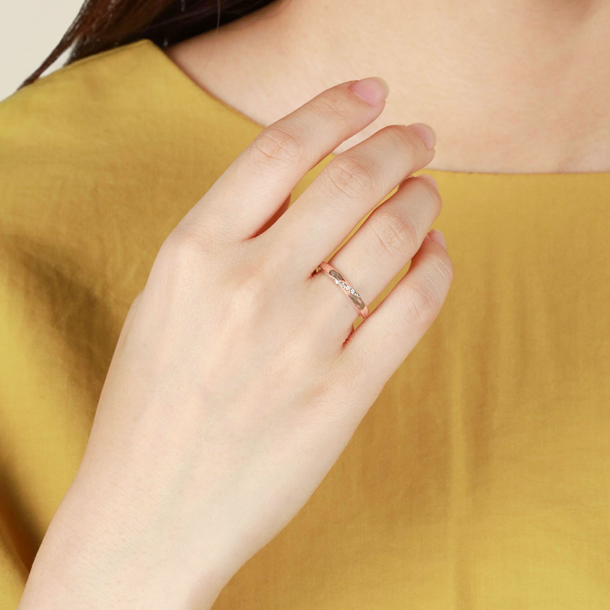 なめらかなピンクゴールドのアームに、ななめにキュービックジルコニアを配したリング。