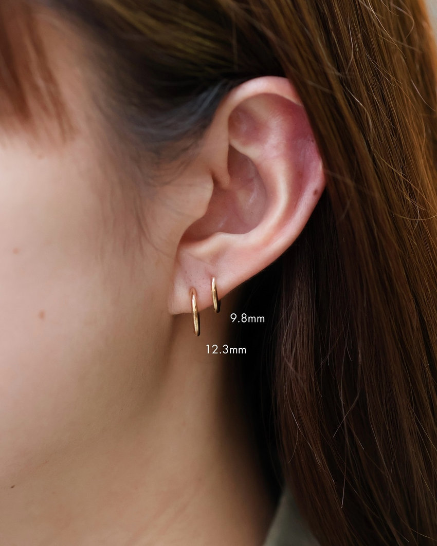シンプルなK18フープピアスを重ね着け。