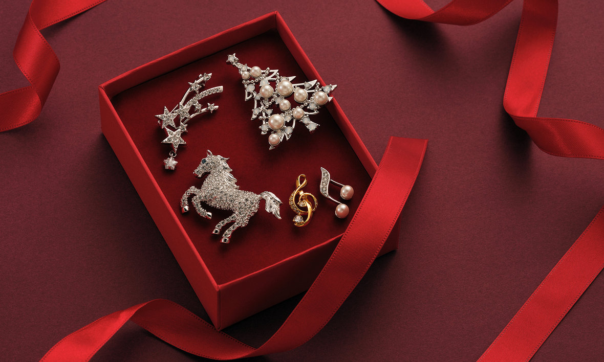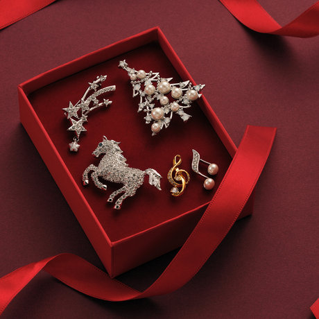 スタイリングに華やかさを添えるブローチはクリスマスから新年にかけての特別なシーズンを彩るアイテム。きらきら光る流れ星、白いパールを雪に見立てたクリスマスツリー、2026年の干支・馬、楽しい音楽が聞こえてきそうなト音記号と音符。ホリデームードを高めるモチーフを、カットガラスやパールの繊細な輝きを添えて、ディティールにこだわりエレガントに表現しました。大切な方へのギフトにもおすすめです。