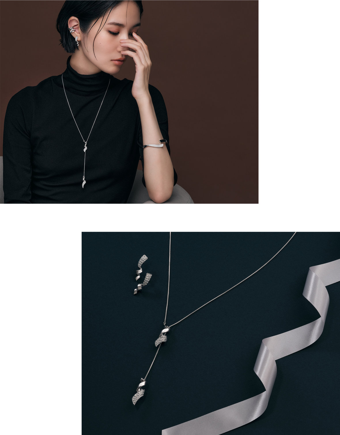 クリスマスパーティーには欠かせないインテリアデコレーションやギフトボックスのリボン。しなやかな螺旋のシルエットからインスピレーションを得た、動きのあるアイコニックなフォルムが魅力のコレクションです。ネックレスはモチーフをスライドしてトップのバランスを変えられる仕様。星空のように煌めくカットガラスが特別な日のスタイルをより輝かせます。