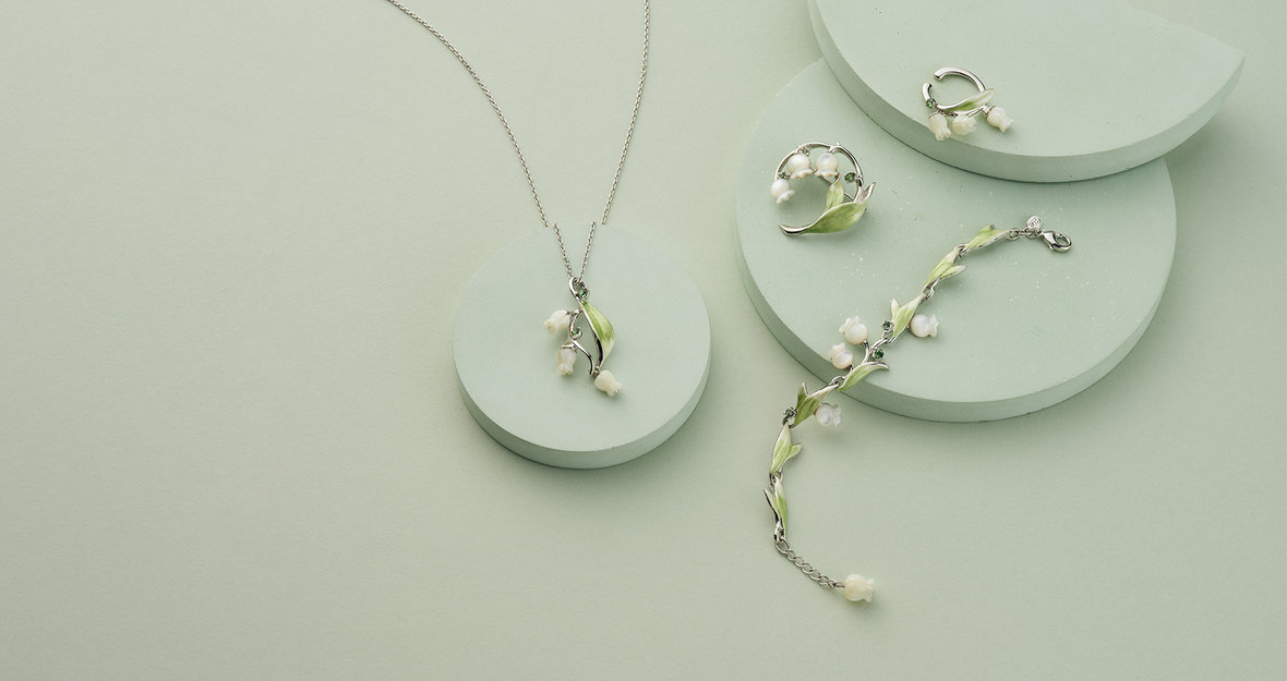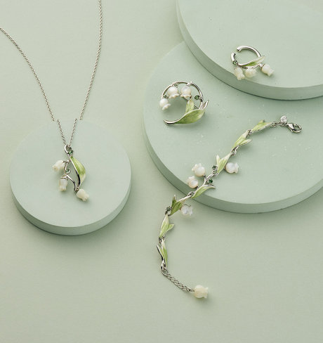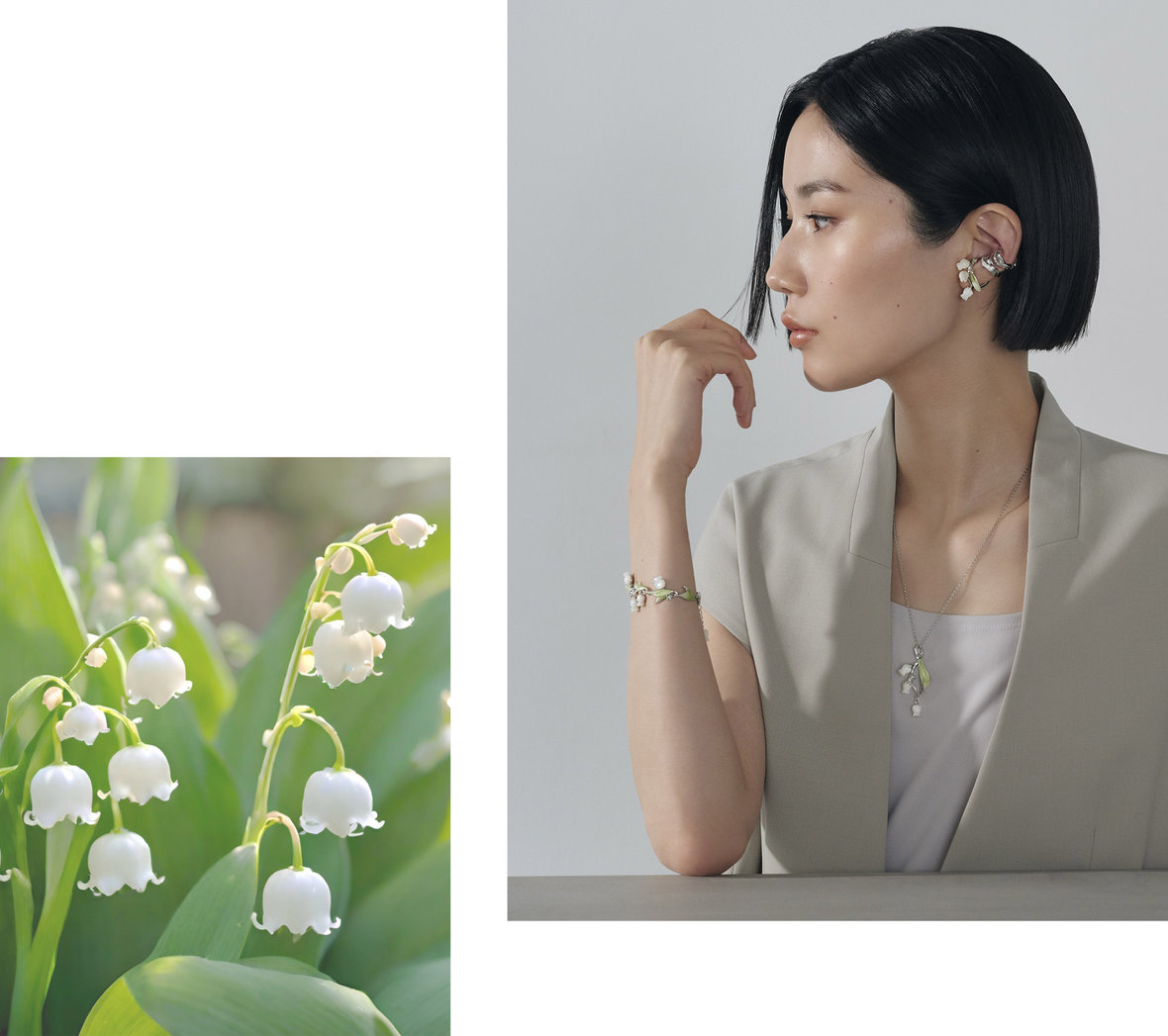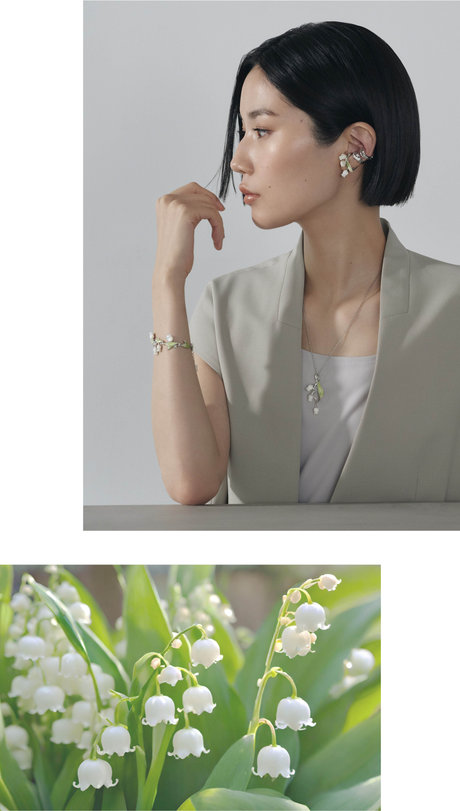 可憐な花と流れるような葉のフォルムが凛とした印象をもたらす、すずらんモチーフのコレクション。白蝶貝の優しい輝きが、エレガントな大人の可愛らしさを感じさせます。しなやかに伸びる葉のグリーンが爽やさを添え、モチーフを重ねても上品にまとまります。耳元には華やかに咲くすずらんのイヤーカフとシルバーのイヤリングをレイヤードし、ほんのりモードな印象のスタイリングに。