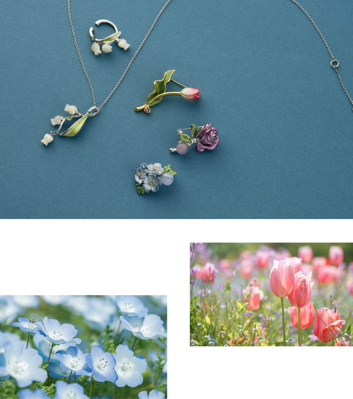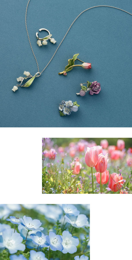 ふっくらとした花と葉のシルエットが美しいチューリップ、華やかな花びらの重なりを表現した深みのある紫のバラ。青空のような澄んだブルーが印象的なネモフィラ。うるわしい春の花々をアクセサリーとして繊細に表現しました。美しい色のグラデーションは、職人がひとつひとつハンドペイントで仕上げたもの。まるで香りが漂ってそうな花本来の美しさを忠実に再現した、クラフトマンシップに溢れるコレクションです。