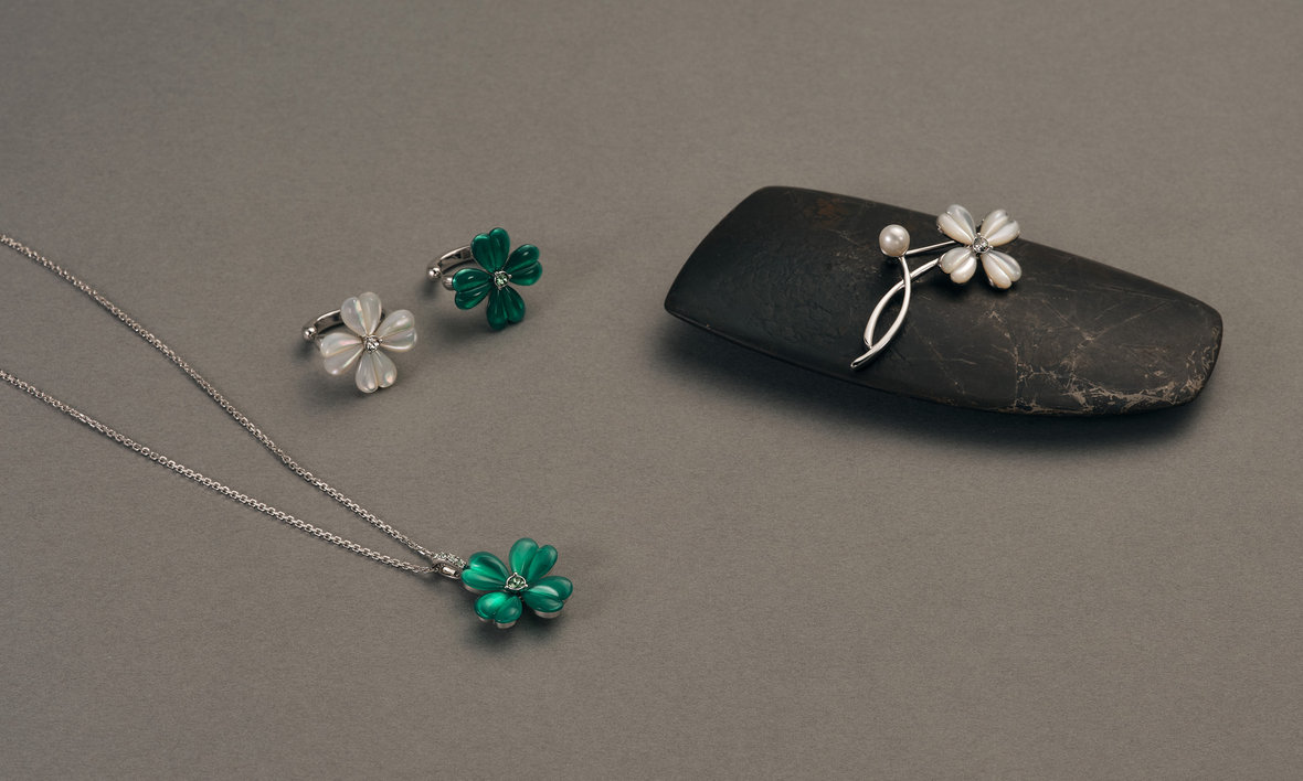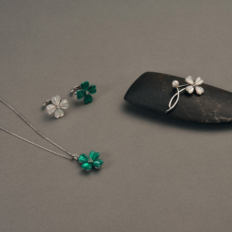 職人が丁寧に象ったクローバーモチーフには、上品な輝きの白蝶貝と透明感のある鮮やかなグリーンカルセドニーを贅沢に使用。ぷっくりとした立体的なオリジナルシェイプがこだわりのデザインです。四つ葉のクローバーは一つ一つの葉に「愛・健康・幸運・富」という意味があります。素敵な出会いや幸運を運んでくれるラッキーモチーフとして大切な方へのギフトにもぴったりです。