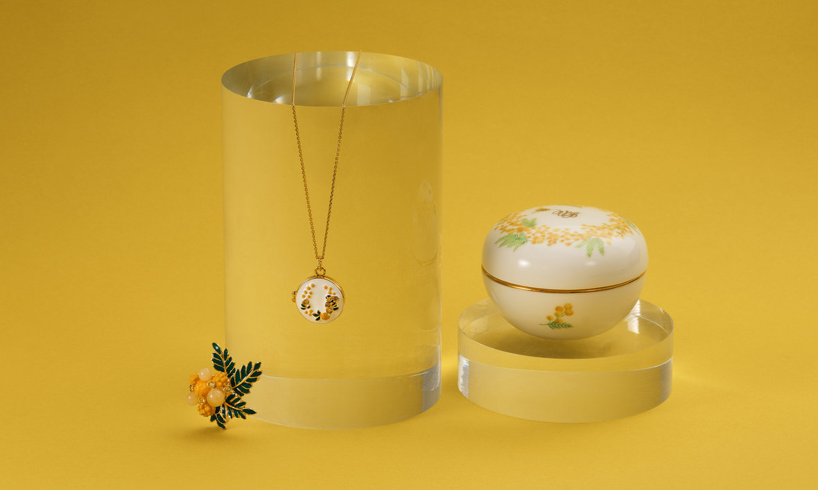 「幸せが宿る器」と言われるボンボニエールは、春を彩るミモザの花と愛らしいミツバチを加飾した、ヴァンドームブティックのためのオリジナルデザイン。ロケットネックレスはボンボニエールに合わせたサークルフォルム。ボーンチャイナをイメージした優しいホワイトカラーをベースに鮮やかなミモザとミツバチを描きました。ブローチは職人が手作業で色付けしたフレッシュなカラーとカルサイトの優しいペールトーンとの組み合わせが魅力です。