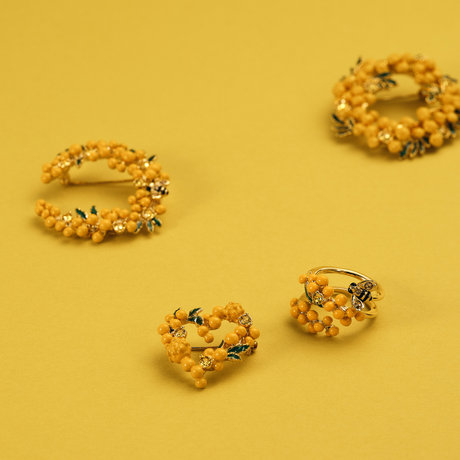 ミモザの蜜の香りに誘われたミツバチが、ちょこんと花にとまっているようなシーンを切り取った愛らしいデザイン。花や葉の鮮やかな色彩は、職人がひとつひとつ丁寧に色付けをしたハンドメイド。朝露のようにさりげなく輝くカットガラスが上品なアクセントに。デザイナーと職人が何度も試行錯誤を重ね、ミモザの鮮やかな色彩や繊細なフォルムをブローチやリングで再現した、クラフトマンシップ溢れるコレクションです。