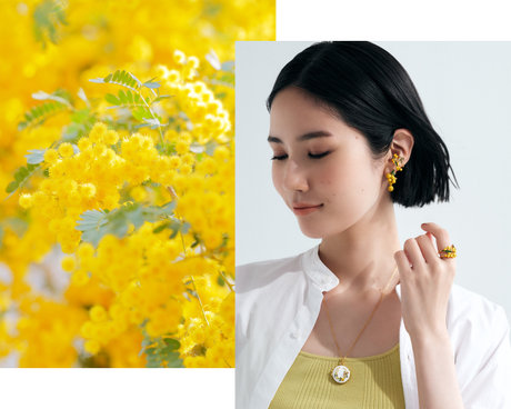 身に着けるだけでポジティブになれるフレッシュなイエローカラーが魅力のミモザコレクション。ミモザの華やかな色彩と可憐なフォルムを再現した、まるで生花のような瑞々しいデザインです。いつものコーディネートにプラスして春のスタイリングを楽しんで。