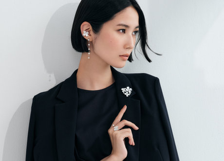 幸運の印と言われる四つ葉のクローバーをモチーフにしたコレクション。可憐な印象のイヤーカフとリングは淡水パールをあしらい、よりエレガントな雰囲気。ブローチは3つのクローバーをハート型のフォルムにセットし、主役級のサイズ感ながら繊細さを併せ持つデザインです。淡水パールのピアスを合わせればノーブルなホワイトカラーでまとめた上品なコーディネートに。シンプルな装いもクラスアップします。