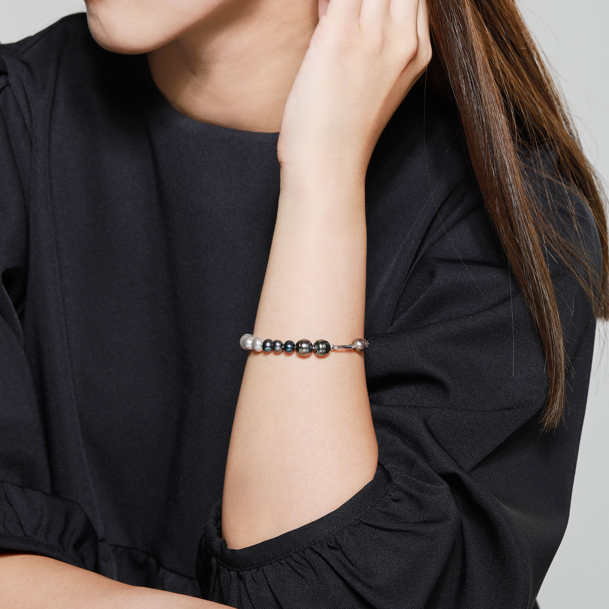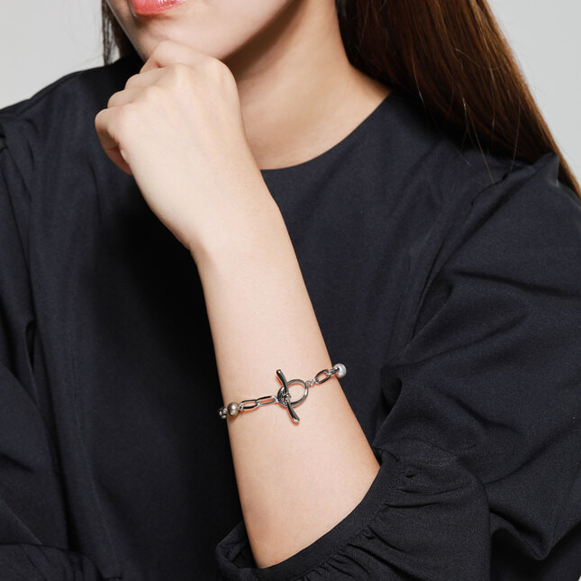 パールの無垢な美しさとクールなステンレスチェーンを組み合わせたアシンメトリーデザインのブレスレット。ホワイトからグレーの淡水パールとバロックシェイプの黒蝶真珠のリズミカルなバイカラーのコントラストが絶妙です。ストリームラインにデザインされたメタルパーツの潔さが加わり、クリーンな印象に仕上がっています。ミニマルでシンプルながらも、シャープなインパクトを与え、ジェンダーを超えて、より一層身につける人のパーソナリティーに沿ったスタイリングをお楽しみいただけます。※素材の特性により、自然素材ならではのふくらみやへこみ(通称えくぼ)等、多少の個体差がございます。 ▼ DRESS UP 商品一覧はこちらhttps://vendome.jp/vendome_boutique/feature/vendome_boutique_dressup